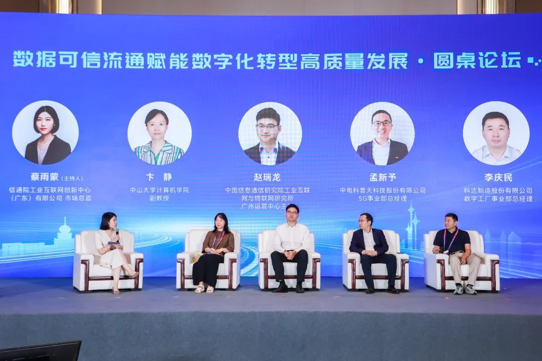 圓桌對話環節,中山大學計算機學院副教授卞靜、中國信通院工業互聯網與物聯網研究所廣州運營中心主任趙瑞龍、中電科普天科技股份有限公司5G事業部總經理孟新予、科達制造股份有限公司數字工廠事業部總經理李慶民就數據可信流通賦能數字化轉型高質量發展進行了討論,信通院工業互聯網創新中心(廣東)有限公司市場總監蔡雨蒙主持。