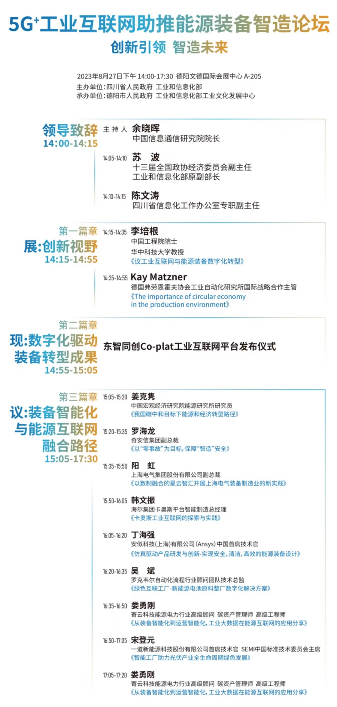 8月27日下午,由四川省人民政府、工業(yè)和信息化部主辦的2023世界清潔能源裝備大會(huì)-5G+工業(yè)互聯(lián)網(wǎng)助推能源裝備智造論壇議即將召開。