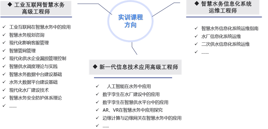 面對行業(yè)人才需求與培養(yǎng),基地主要開展三大方向高級工程師的實(shí)訓(xùn):工業(yè)互聯(lián)網(wǎng)智慧水務(wù)高級工程師、新一代信息技術(shù)應(yīng)用高級工程師、智慧水務(wù)信息化系統(tǒng)運(yùn)維工程師。