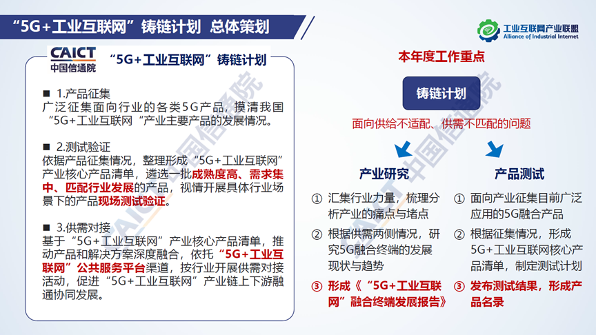 為解決產業發展所需,中國信息通信研究院正式啟動“5G+工業互聯網”鑄鏈計劃(以下簡稱“鑄鏈計劃”),通過工業互聯網產業聯盟渠道集結產業力量,共同鑄造“5G+工業互聯網”產業鏈,助力供需兩側實現充分有效的產業對接,強化5G技術優勢的帶動輻射作用,為下一階段“5G+工業互聯網”產業發展注智賦能。