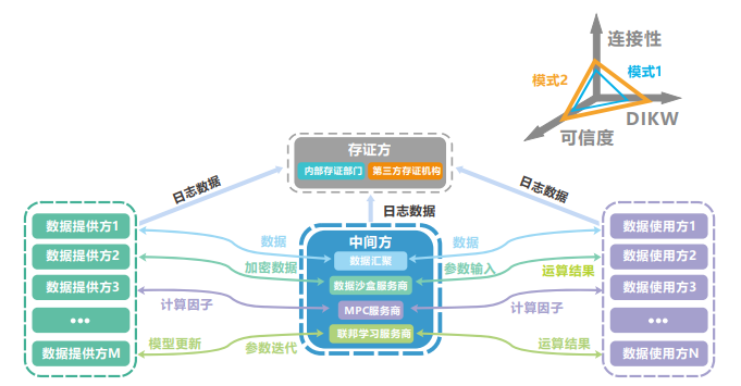 三是可信數(shù)據(jù)空間融合模式。主要基于模式一和模式二中各利益相關(guān)方對(duì)數(shù)據(jù)使用范圍、深度和可信的不同要求,在模式三中,定義了五種主要參與方,包括數(shù)據(jù)提供方、數(shù)據(jù)使用方、存證方、中間服務(wù)方和IT基礎(chǔ)設(shè)施提供方。該類模式覆蓋的角色和業(yè)務(wù)流程相對(duì)完整,也構(gòu)成了可信數(shù)據(jù)空間的業(yè)務(wù)視圖(如圖3所示),后續(xù)的功能視角和技術(shù)視角將依此視圖進(jìn)行展開。