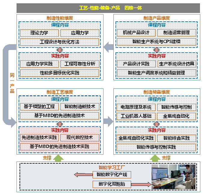 結合典型機電一體化產品生產流程,完成了培養方案建設,提出了包含制造工藝、制造性能、制造裝備和制造產品的四個維度課程體系。以產品的智能化為核心,傳感器與人機交互技術為重點,數字化制造技術為關鍵,智能設計技術為靈魂,基于開放物聯網的網絡協同制造技術和基于大數據的遠程運維技術為手段,課程內容連貫性大幅提升。主要內容包括:基于MBD的先進制造技術、智能制造新技術、基于模型的工程(MBE)、產品性能優化與數值分析、機械產品設計基礎。