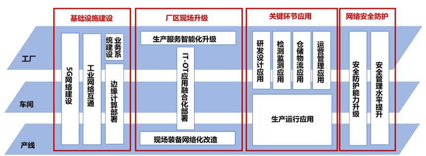 產(chǎn)線級(jí)聚焦在設(shè)備連接、數(shù)據(jù)采集和5G應(yīng)用到生產(chǎn)控制環(huán)節(jié)等方面能力建設(shè)。