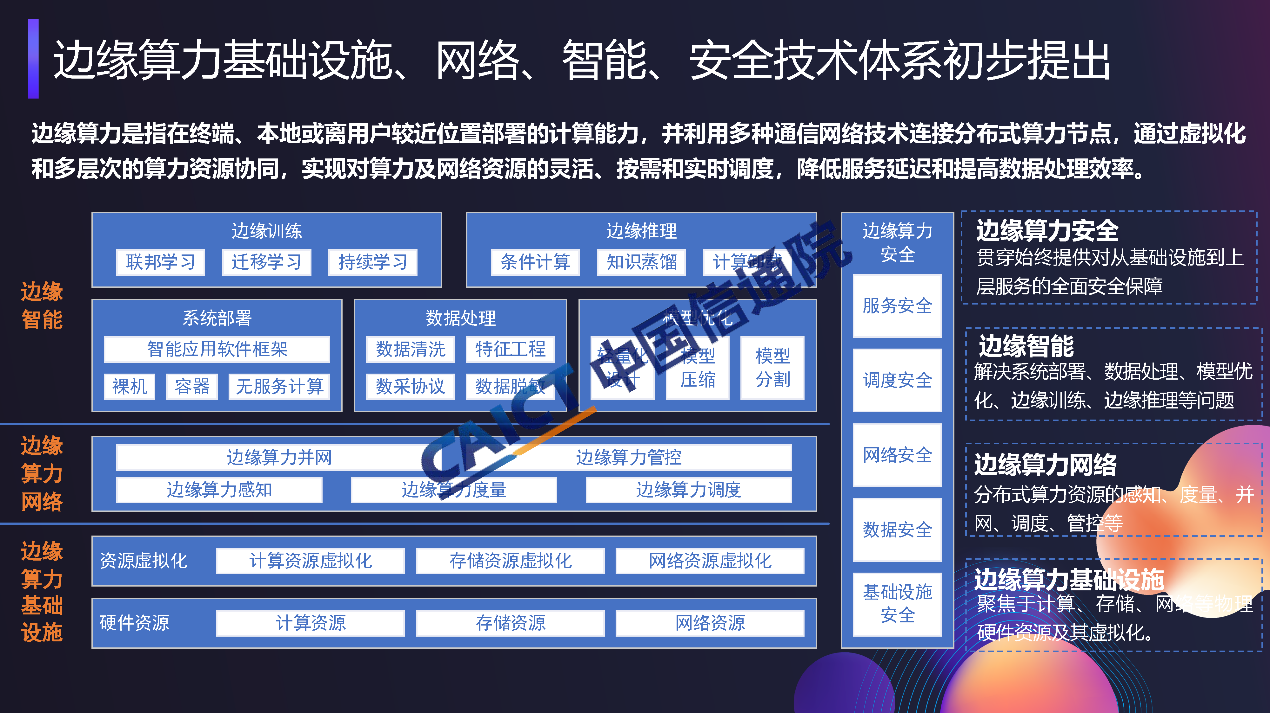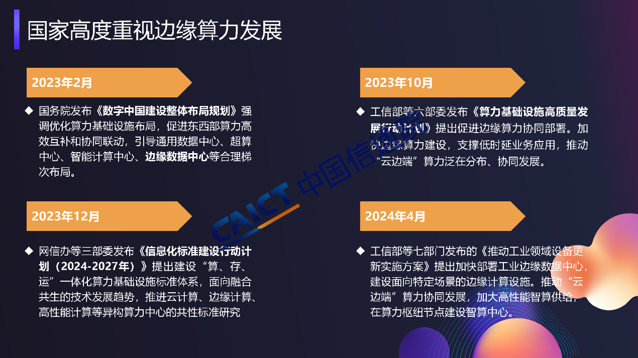 工信部等六部委聯(lián)合發(fā)布《算力基礎(chǔ)設(shè)施高質(zhì)量發(fā)展行動(dòng)計(jì)劃》,明確提出促進(jìn)邊緣算力協(xié)同部署,加快邊緣算力建設(shè),支撐工業(yè)制造、金融交易、智能電網(wǎng)、云游戲等低時(shí)延業(yè)務(wù)應(yīng)用,推動(dòng)“云邊端”算力泛在分布、協(xié)同發(fā)展。中國鐵塔、中國信通院、中國聯(lián)通、中國移動(dòng)等單位共同啟動(dòng)邊緣算力研究項(xiàng)目,并形成了《邊緣算力藍(lán)皮書》,也期待與行業(yè)內(nèi)合作伙伴共同合作,持續(xù)推動(dòng)邊緣算力技術(shù)體系構(gòu)建及產(chǎn)業(yè)生態(tài)發(fā)展。