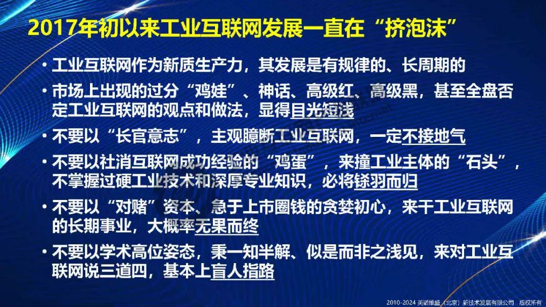 中國工業互聯網兼容繼承了兩化融合、企業信息化、工業自動化、智能制造、CIMS、IPD、數字化轉型、新型工業化等多模式活動,以可持續融合創新方式,支撐、優化、賦能企業發展,對推動制造業轉型升級、提升生產效率、降低運營成本等方面具有重要意義。在過去多年發展中工業互聯網已經擠出很多泡沫,即將迎來高質量發展新時期。