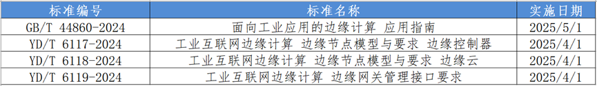2024年9月20日,工信部印發(fā)《工業(yè)重點(diǎn)行業(yè)領(lǐng)域設(shè)備更新和技術(shù)改造指南》的通知,提出“部署邊緣計(jì)算節(jié)點(diǎn)、邊緣計(jì)算網(wǎng)關(guān)、邊緣控制器、邊緣云等工業(yè)算力設(shè)備”要求,明確“力爭(zhēng)到2027年,80%的規(guī)模以上制造業(yè)企業(yè)基本實(shí)現(xiàn)網(wǎng)絡(luò)化改造,邊緣網(wǎng)關(guān)、邊緣控制器等產(chǎn)品部署超過(guò)100萬(wàn)臺(tái)”目標(biāo)。2024年10月26日,由機(jī)械工業(yè)儀器儀表綜合技術(shù)經(jīng)濟(jì)研究所、中國(guó)信息通信研究院(以下簡(jiǎn)稱(chēng)“中國(guó)信通院”)、中國(guó)科學(xué)院沈陽(yáng)自動(dòng)化研究所等聯(lián)合牽頭的《面向工業(yè)應(yīng)用的邊緣計(jì)算 應(yīng)用指南》國(guó)家標(biāo)準(zhǔn)正式發(fā)布。2024年12月25日,《工業(yè)互聯(lián)網(wǎng)邊緣計(jì)算 邊緣節(jié)點(diǎn)模型與要求 邊緣控制器》、《工業(yè)互聯(lián)網(wǎng)邊緣計(jì)算 邊緣節(jié)點(diǎn)模型與要求 邊緣云》、《工業(yè)互聯(lián)網(wǎng)邊緣計(jì)算 邊緣網(wǎng)關(guān)管理接口要求》等3項(xiàng)工業(yè)互聯(lián)網(wǎng)邊緣計(jì)算行業(yè)標(biāo)準(zhǔn)正式發(fā)布。
