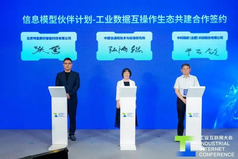 在信息模型伙伴計劃-工業(yè)數(shù)據(jù)互操作生態(tài)共建合作簽約儀式環(huán)節(jié),中國信通院技術(shù)與標(biāo)準(zhǔn)研究所所長張海懿、中科斯歐(合肥)科技股份有限公司董事長于萬欽、北京坤盈數(shù)科智能科技有限公司總經(jīng)理張譽共同簽約。后續(xù),三方將在工業(yè)數(shù)據(jù)互操作領(lǐng)域深化合作,共同開展技術(shù)研究、標(biāo)準(zhǔn)編制、案例打造等工作,攜手推動信息模型發(fā)展。