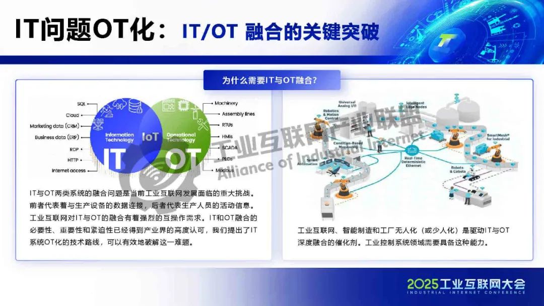 IT與OT兩類系統(tǒng)的融合問題是當前工業(yè)互聯(lián)網(wǎng)發(fā)展面臨的重大挑戰(zhàn)。前者代表著與生產(chǎn)設備的數(shù)據(jù)連接,后者代表生產(chǎn)人員的活動信息。工業(yè)互聯(lián)網(wǎng)對IT與OT的融合有著強烈的互操作需求。IT和OT融合的必要性、重要性和緊迫性已經(jīng)得到產(chǎn)業(yè)界的高度認可,我們提出了IT系統(tǒng)OT化的技術路線,可以有效地破解這一難題。