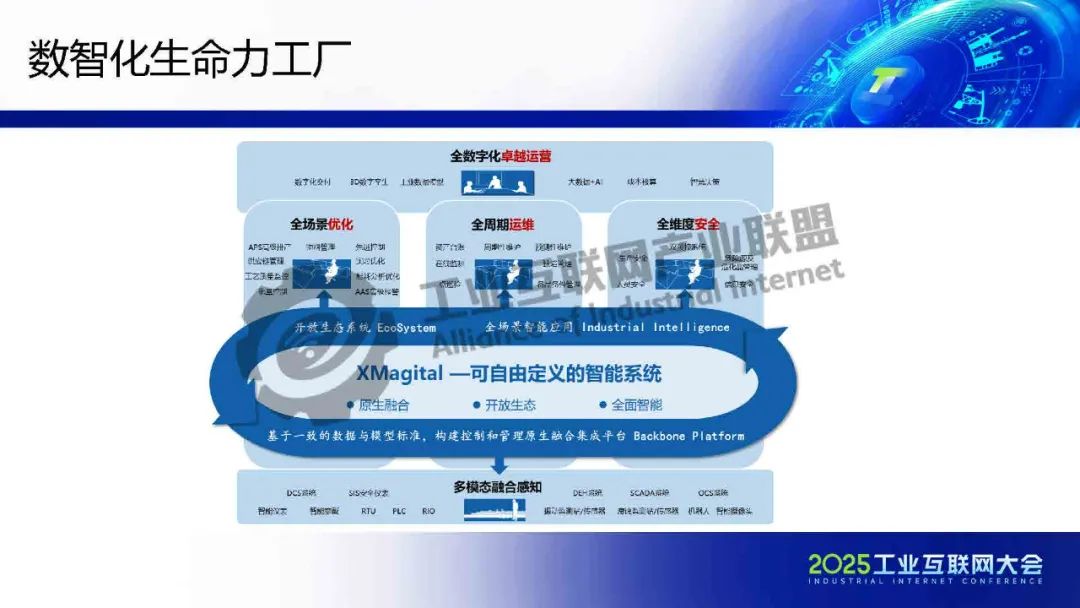 龔濤介紹,制造的本質在于訂單、產品和生產系統三大生命周期的動態協同。在VUCA時代,新能源汽車等行業的快速迭代與傳統剛性產線矛盾凸顯,要求生產系統具備柔性(按訂單生產)、彈性(多代產能調配)和塑性(產線靈活重組)能力。數字化轉型需基于CPS實現數據的自由流動,構建云邊端協同體系架構。和利時XMagital平臺融合OT/IT/AI多種技術,形成“資源實體-信息模型-業務流程”等制造資源的互聯互通互操作體系,打造具備生物體特性的"數智化生命力工廠",推動工業生產系統從機械、電氣、信號連接到數據連接的范式躍遷。