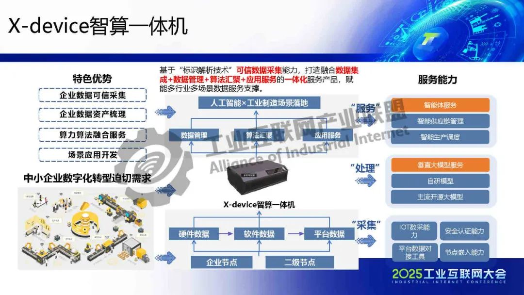 X-device智算一體機是基于“標識解析技術”可信數據采集能力,打造融合數據集成+數據管理+算法匯聚+應用服務的一體化服務產品,賦能多行業(yè)多場景數據服務支撐。