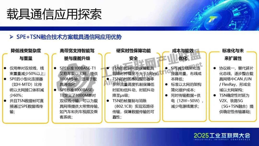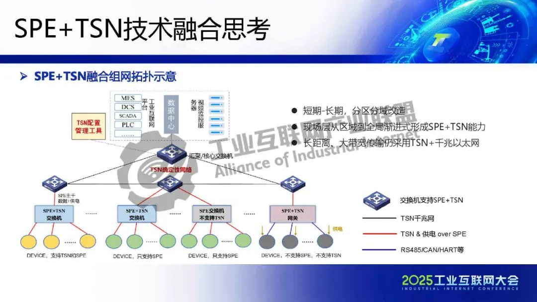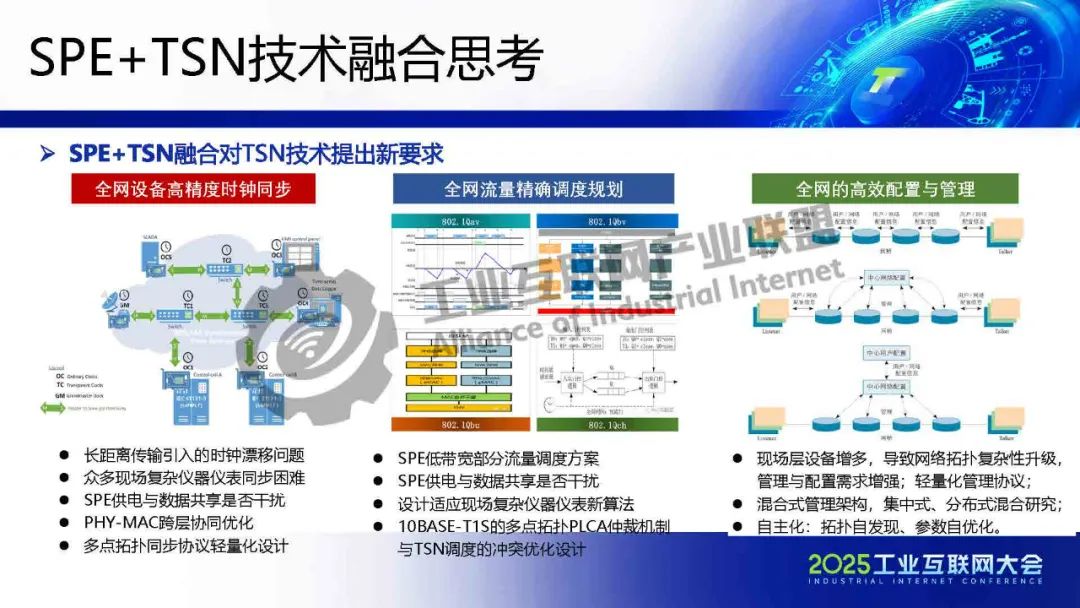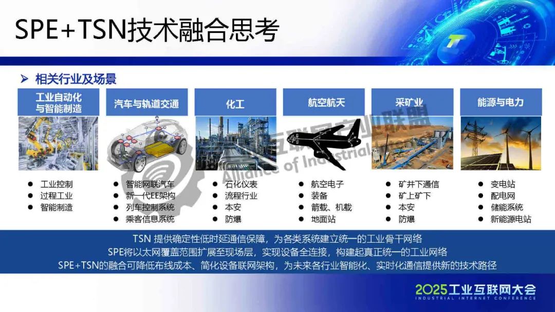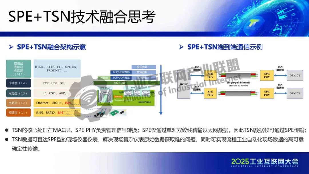 李慶介紹,TSN 提供確定性低時延通信保障,為各類系統建立統一的工業骨干網絡。SPE將以太網覆蓋范圍擴展至現場層,實現設備全連接,構建起真正統一的工業網絡。SPE+TSN的融合可降低布線成本、簡化設備聯網架構,為未來各行業智能化、實時化通信提供新的技術路徑。
