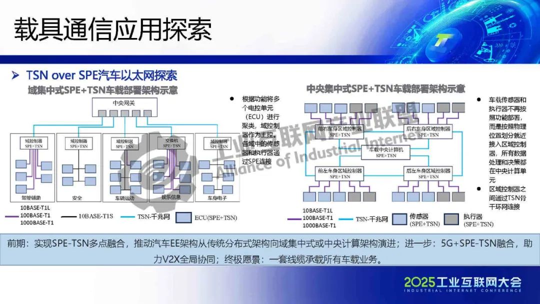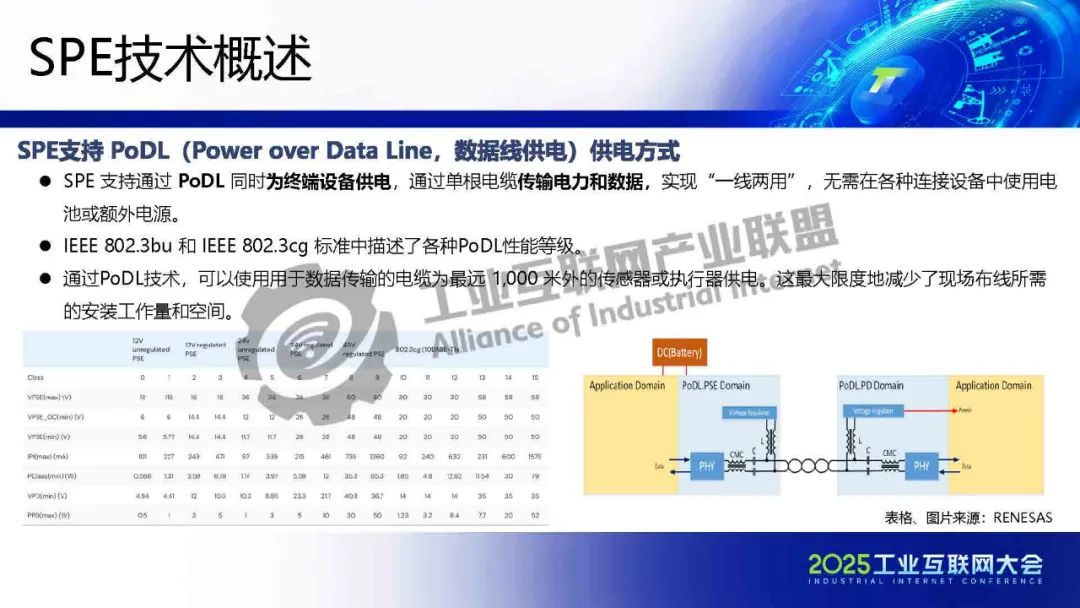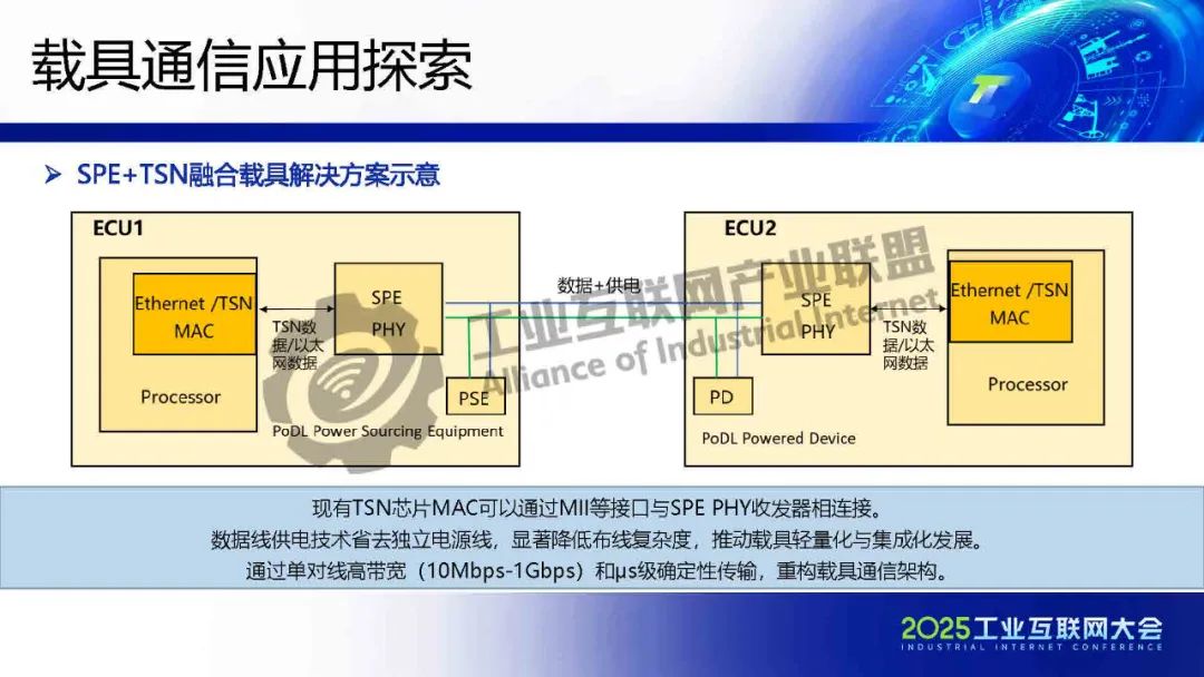 現有TSN芯片MAC可以通過MII等接口與SPE PHY收發器相連接。數據線供電技術省去獨立電源線,顯著降低布線復雜度,推動載具輕量化與集成化發展。通過單對線高帶寬(10Mbps-1Gbps)和μs級確定性傳輸,重構載具通信架構。