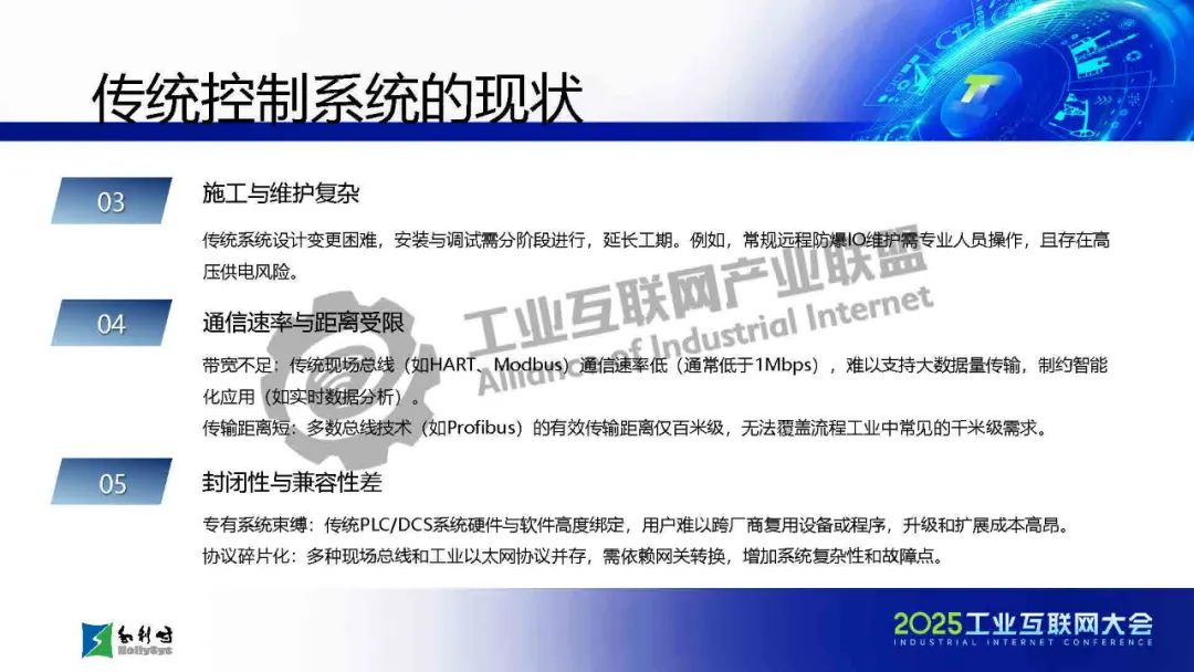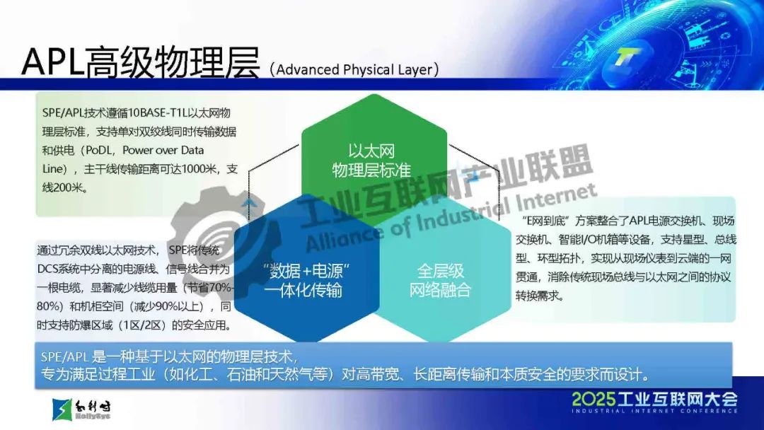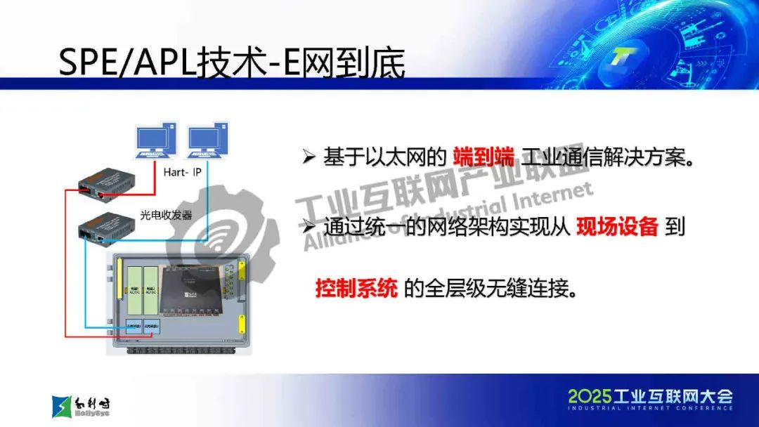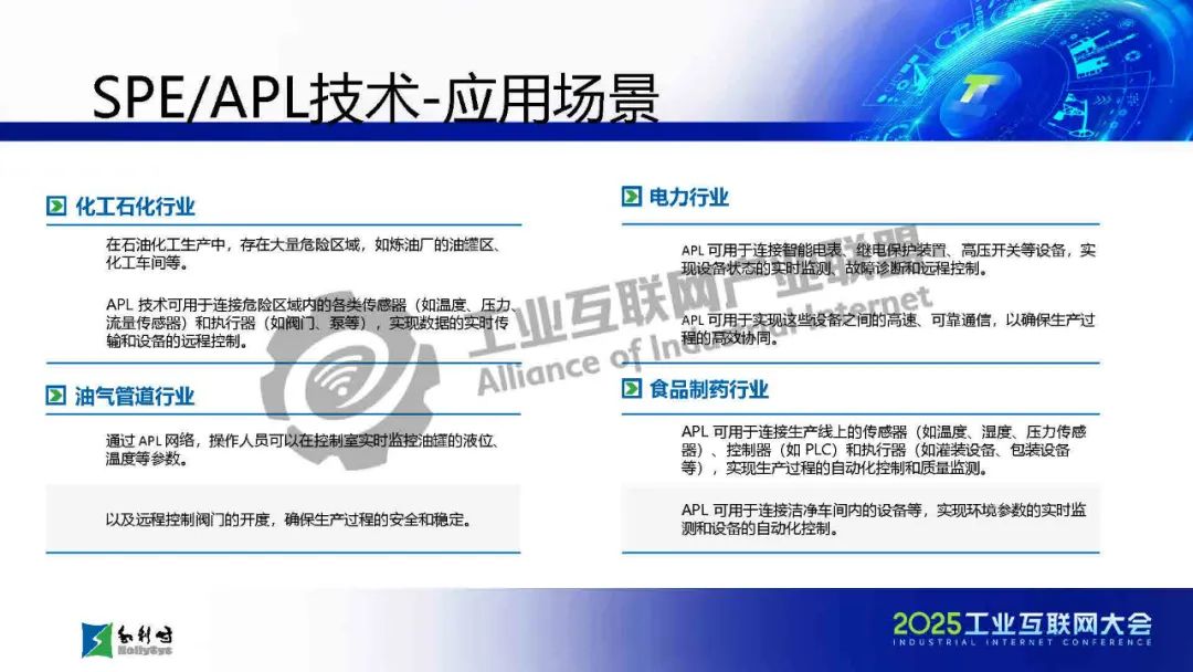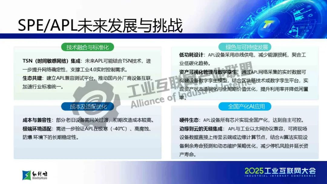 馬曉偉介紹,傳統工業通信面臨布線復雜、協議碎片化、帶寬不足等挑戰,而SPE/APL技術通過單對以太網和高級物理層創新,實現了千米級傳輸、10Mbps高帶寬、本質安全和一網到底的架構,大幅簡化布線并提升兼容性。該技術已應用于石化、電力等流程工業,支持從現場設備到云端的全層級數據貫通。報告還展示了基于APL的新一代DCS架構和七大系列產品,并指出未來發展方向:融合TSN增強實時性、構建開放生態、推動綠色低碳,以及結合AI實現預測性維護。最后強調國產化芯片和極端環境適配是技術落地的關鍵挑戰。SPE/APL技術將助力工業通信向智能化、標準化和可持續方向演進。