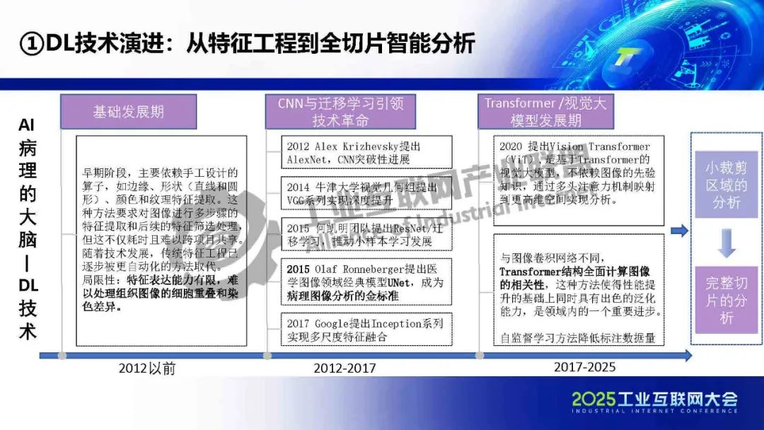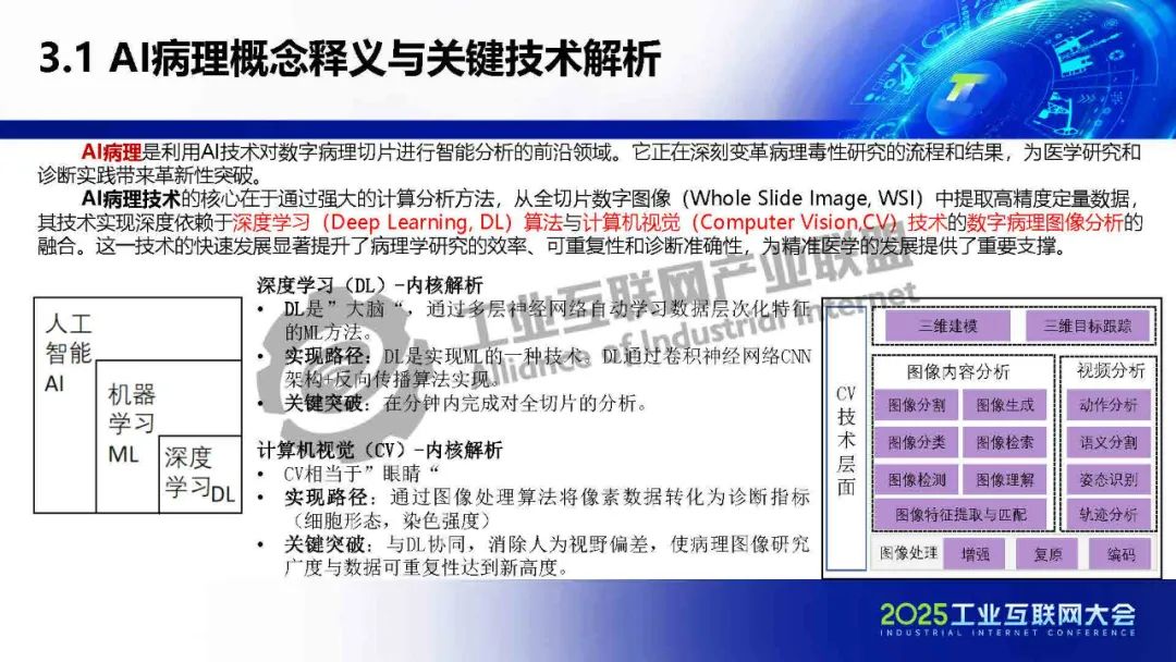 AI病理技術的核心在于通過強大的計算分析方法,從全切片數字圖像(Whole Slide Image, WSI)中提取高精度定量數據,其技術實現深度依賴于深度學習(Deep Learning, DL)算法與計算機視覺(Computer Vision,CV)技術的數字病理圖像分析的融合。這一技術的快速發展顯著提升了病理學研究的效率、可重復性和診斷準確性,為精準醫學的發展提供了重要支撐。