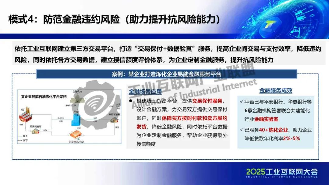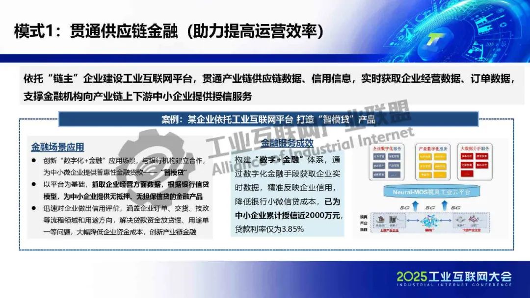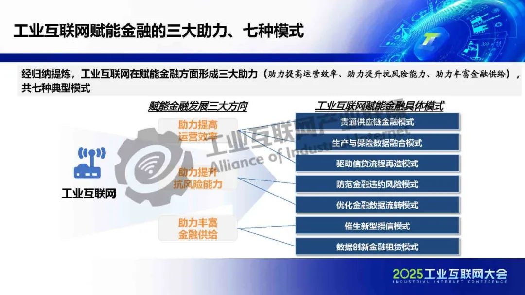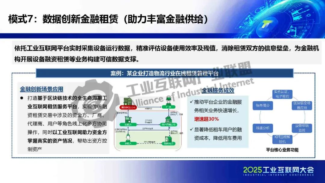 貫通供應(yīng)鏈金融工業(yè)互聯(lián)網(wǎng)在賦能金融方面形成三大助力(助力提高運(yùn)營效率、助力提升抗風(fēng)險(xiǎn)能力、助力豐富金融供給),共七種典型模式:貫通供應(yīng)鏈金融、生產(chǎn)與保險(xiǎn)數(shù)據(jù)融合、驅(qū)動(dòng)信貸流程再造、防范金融違約風(fēng)險(xiǎn)、優(yōu)化金融數(shù)據(jù)流轉(zhuǎn)、催生新型授信方式和數(shù)據(jù)創(chuàng)新金融租賃。