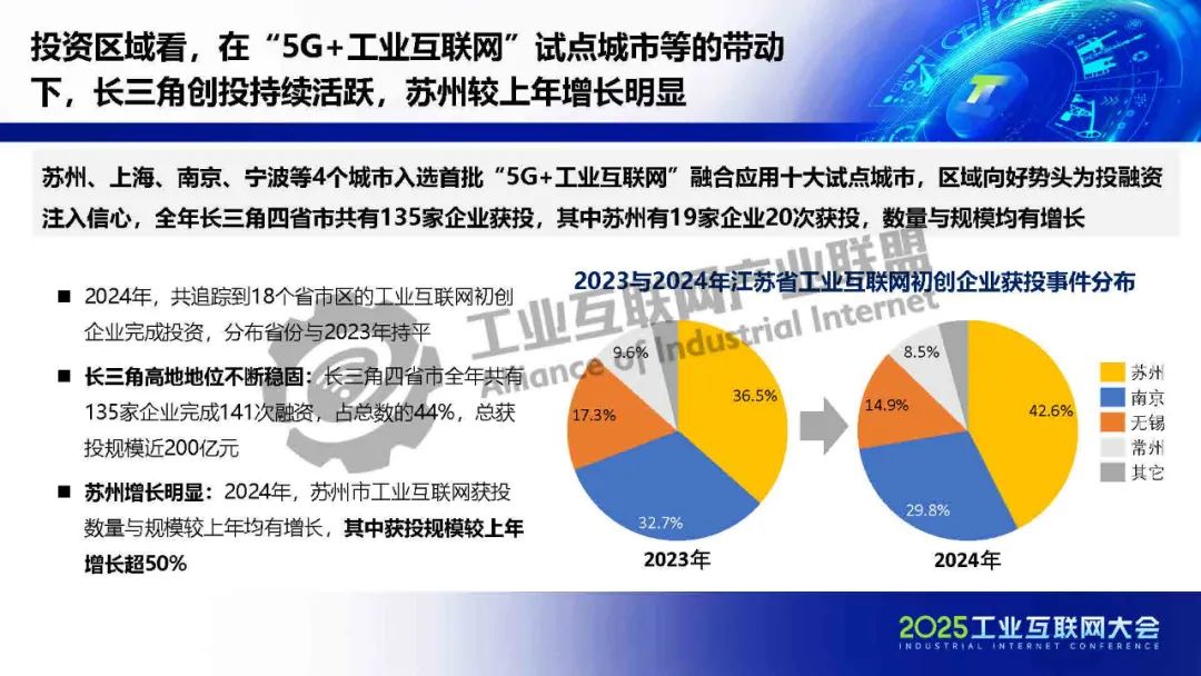 肖榮美介紹,近期,引導(dǎo)金融支持工業(yè)互聯(lián)網(wǎng)的政策導(dǎo)向更加清晰,釋放積極的行業(yè)信號(hào)。圍繞政策部署、公共服務(wù)等方面,政府層面開展了一系列推動(dòng)工業(yè)互聯(lián)網(wǎng)產(chǎn)融合作的工作部署。工業(yè)互聯(lián)網(wǎng)上市企業(yè)逆勢(shì)擴(kuò)容,呈現(xiàn)出“穩(wěn)”的增長趨勢(shì);初創(chuàng)企業(yè)融資回暖,“智”的特征突出;投資主體看,“國家隊(duì)”“大廠”紛紛下場(chǎng),促進(jìn)實(shí)數(shù)深度融合。投資區(qū)域看,在“5G+工業(yè)互聯(lián)網(wǎng)”試點(diǎn)城市等的帶動(dòng)下,長三角創(chuàng)投持續(xù)活躍,蘇州較上年增長明顯。
