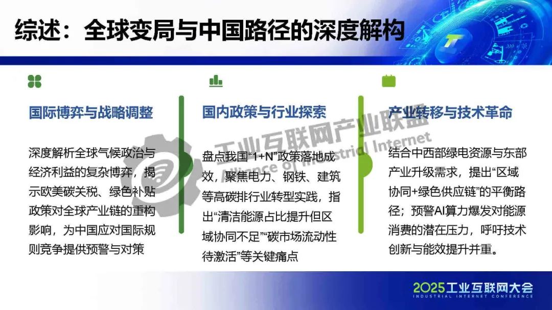 全球變局與中國路徑的深度解構:一是深度解析全球氣候政治與經濟利益的復雜博弈,揭示歐美碳關稅、綠色補貼政策對全球產業鏈的重構影響,為中國應對國際規則競爭提供預警與對策;二是盤點我國“1+N”政策落地成效,聚焦電力、鋼鐵、建筑等高碳排行業轉型實踐,指出“清潔能源占比提升但區域協同不足”“碳市場流動性待激活”等關鍵痛點;三是結合中西部綠電資源與東部產業升級需求,提出“區域協同+綠色供應鏈”的平衡路徑;預警AI算力爆發對能源消費的潛在壓力,呼吁技術創新與能效提升并重。