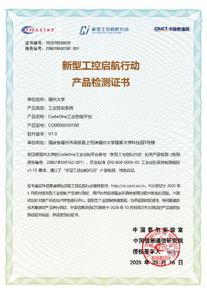 經過中國信息通信研究院集中測試,福州大學工業自動化控制技術與信息處理福建省高校重點實驗室自主研發的CodeOne工業控制平臺,憑借圖形無代碼編程架構與多品牌PLC無縫兼容的核心優勢,順利通過本次“新型工控啟航行動”產品測試。目前CodeOne平臺已在新能源、電力、化工、機械、紡織、家具、電池、市政等多個行業實現規模化應用,成功替代國外工控系統,推動國產裝備在汽車制造、新能源等高端技術領域的自主化突破。