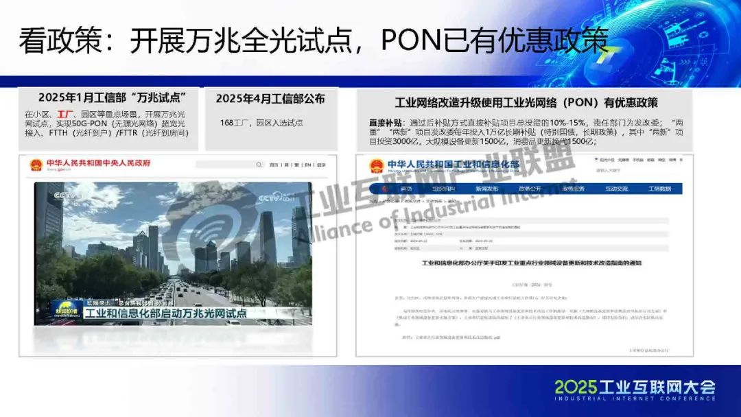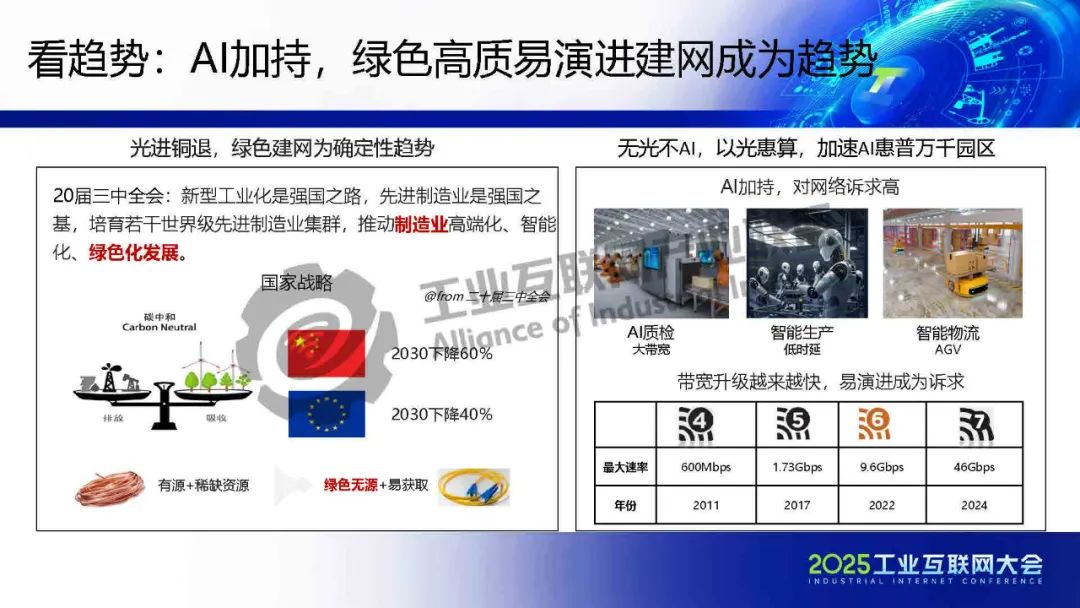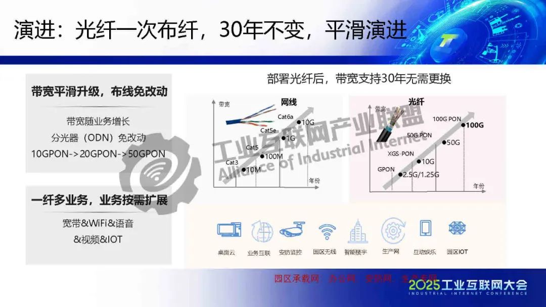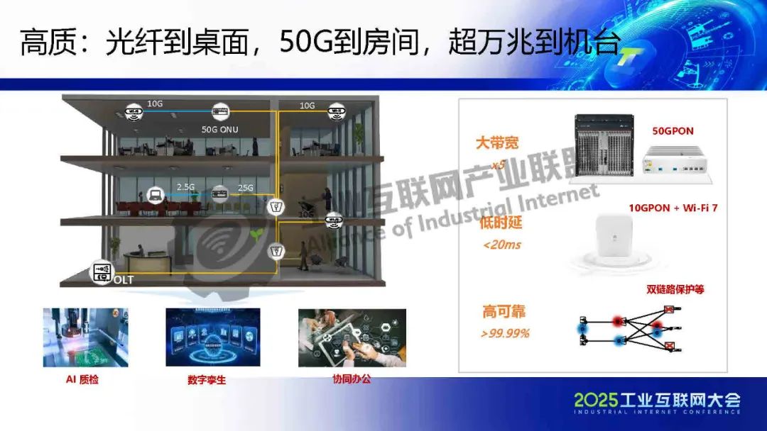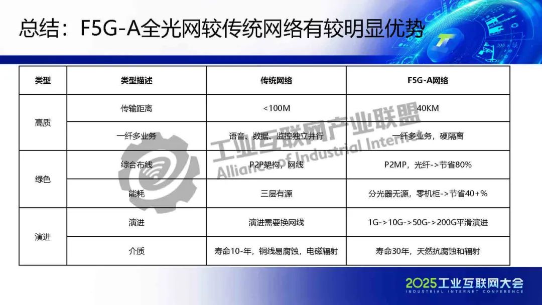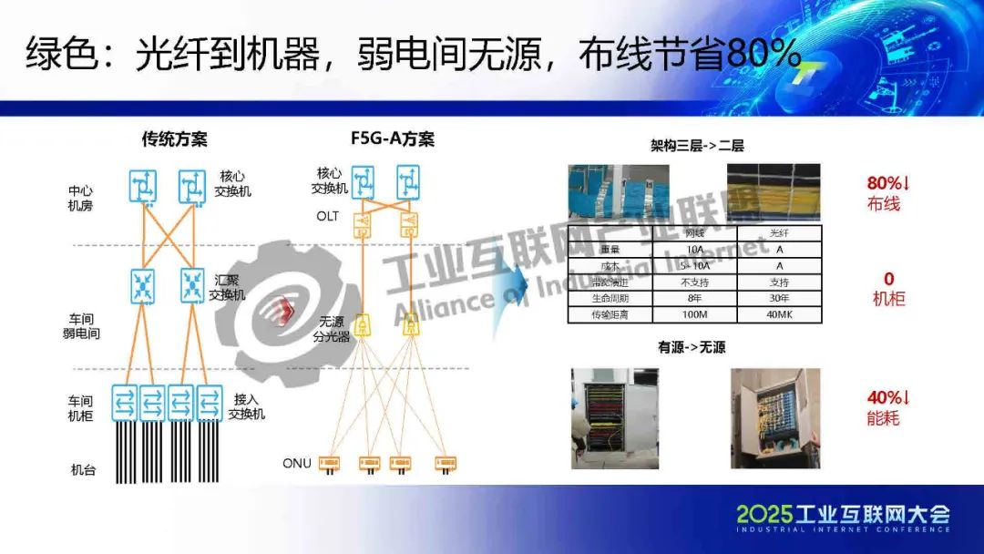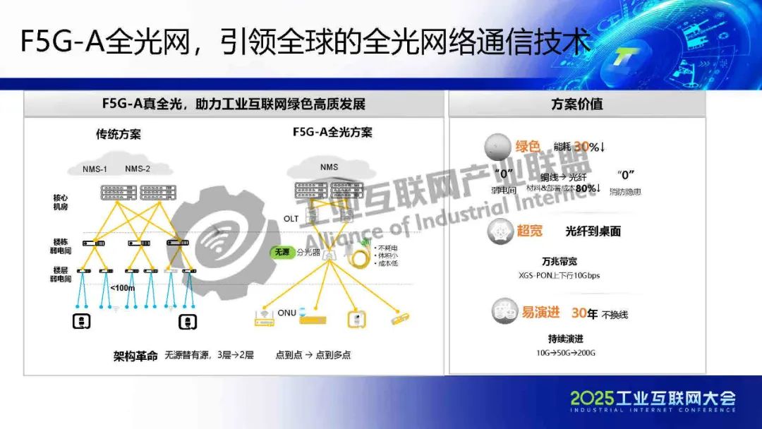 F5G-A全光網通過架構革新和全光化升級,為工業互聯網提供綠色高效的通信解決方案。相比傳統方案,F5G-A采用統一網管和光線路終端,實現三大核心優勢:一是綠色節能,能耗降低30%,以光纖替代銅線實現零電磁干擾,減少80%弱電間建設和維護成本。二是超寬性能,支持光纖到桌面的10Gbps對稱帶寬。三是長期兼容,線路30年無需更換并可平滑升級至200G速率。通過將網絡架構從3層簡化為2層、拓撲從點到點優化為點到多點,F5G-A在降低復雜度的同時提升了傳輸效率,為工業數字化轉型提供了高帶寬、低時延、可持續的新一代網絡基礎設施。