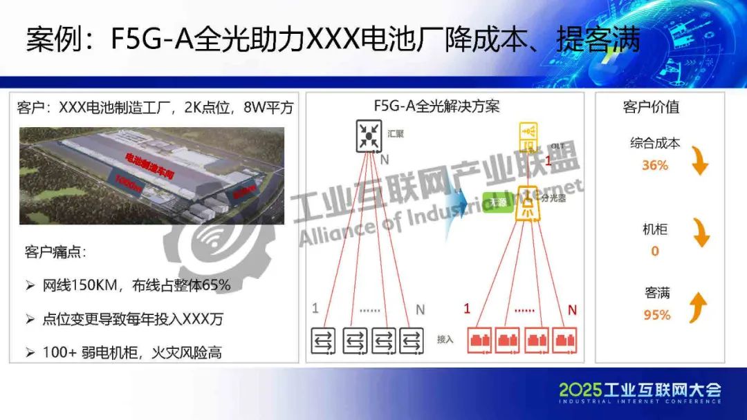 龔奎介紹,在工業園區網絡建設中,光進銅退是大趨勢,F5G-A全光園區方案因光纖介質易獲取、無源傳輸等優勢,可實現綠色節能,且能更好滿足AI應用對大帶寬、低時延的要求。國家政策也支持PON技術在園區應用。華為的F5G-A園區網絡解決方案,具有綠色、高質、易演進特點,采用光纖到機器、無源分光器等技術,可節省部件成本80%以上,減少弱電機柜需求,還具備長生命周期、強抗干擾性、相對無限帶寬等優勢,能適應技術快速演進。如某電池工廠應用后,綜合造價成本降低30%以上,客戶滿意度提升。目前,已聯合各方發布F5G-A在工業園區的標準,推動產業發展。