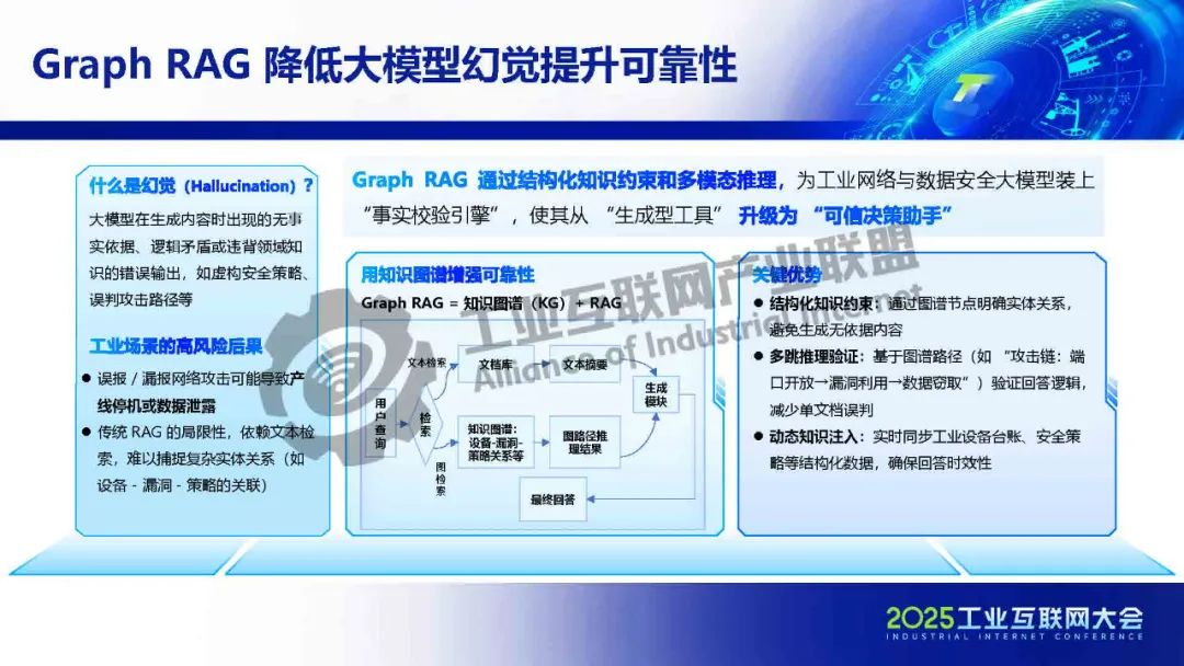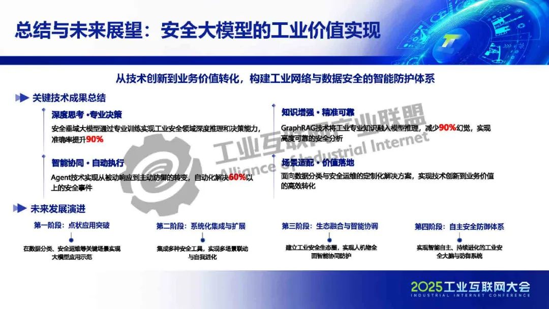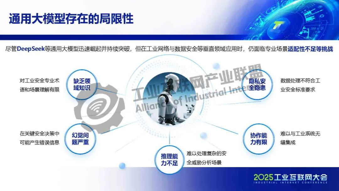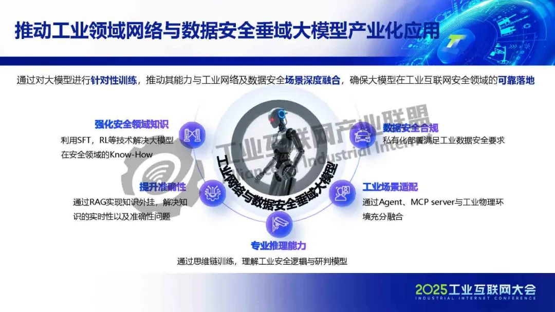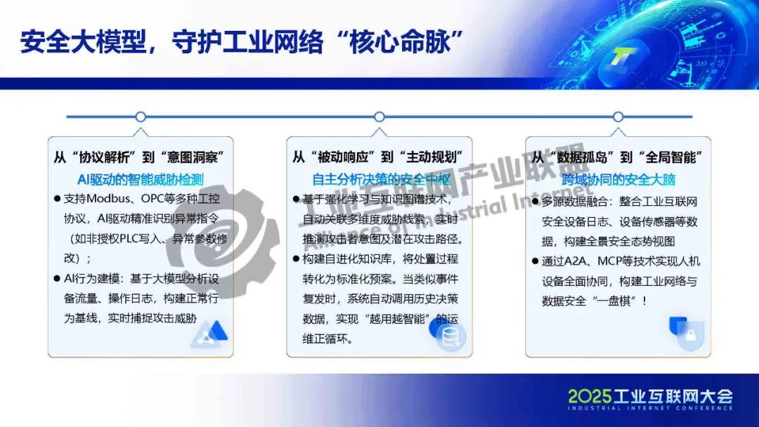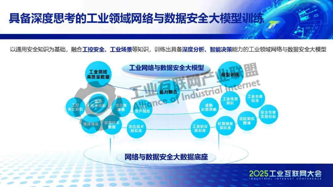 孫浩介紹,盡管DeepSeek等通用大模型迅速崛起并持續(xù)突破,但在工業(yè)網(wǎng)絡(luò)與數(shù)據(jù)安全等垂直領(lǐng)域應(yīng)用時(shí),仍面臨專業(yè)場(chǎng)景適配性不足等挑戰(zhàn)。工業(yè)網(wǎng)絡(luò)與安全應(yīng)用通過(guò)對(duì)大模型進(jìn)行針對(duì)性訓(xùn)練,推動(dòng)其能力與工業(yè)網(wǎng)絡(luò)及數(shù)據(jù)安全場(chǎng)景深度融合,確保大模型在工業(yè)互聯(lián)網(wǎng)安全領(lǐng)域的可靠落地,以通用安全知識(shí)為基礎(chǔ),融合工控安全、工業(yè)場(chǎng)景等知識(shí),訓(xùn)練出具備深度分析、智能決策能力的工業(yè)領(lǐng)域網(wǎng)絡(luò)與數(shù)據(jù)安全大模型。