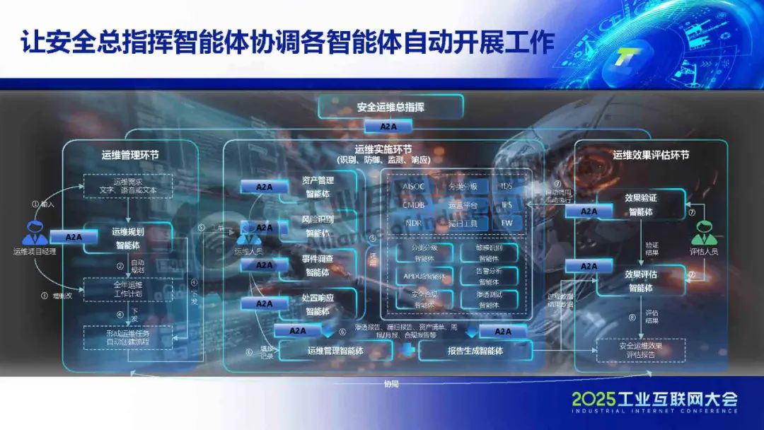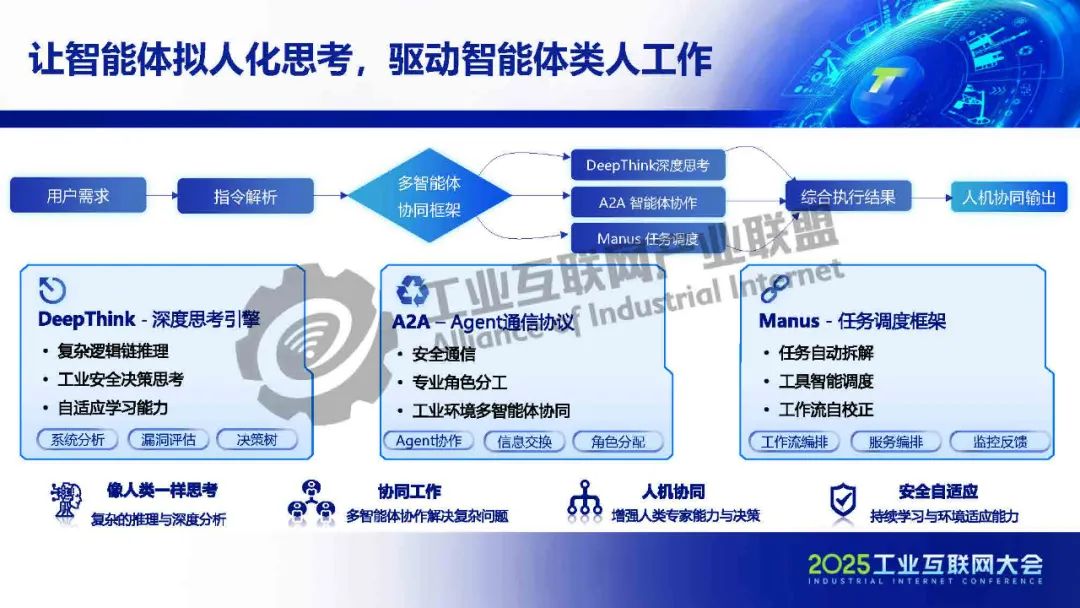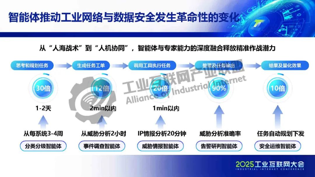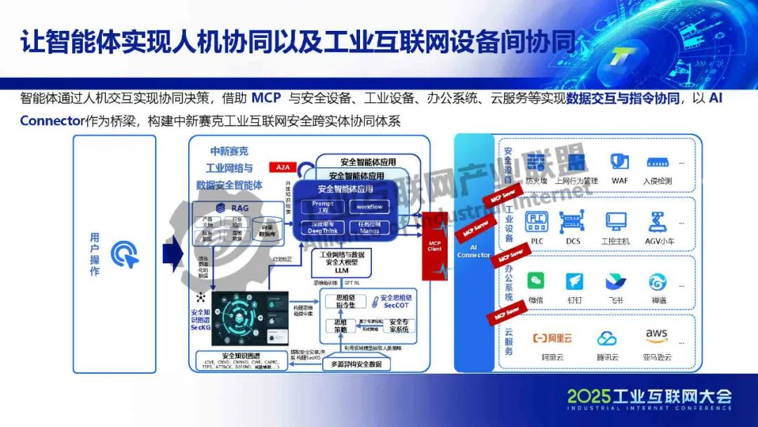智能體通過(guò)人機(jī)交互實(shí)現(xiàn)協(xié)同決策,借助 MCP 與安全設(shè)備、工業(yè)設(shè)備、辦公系統(tǒng)、云服務(wù)等實(shí)現(xiàn)數(shù)據(jù)交互與指令協(xié)同,以 AI Connector作為橋梁,構(gòu)建中新賽克工業(yè)互聯(lián)網(wǎng)安全跨實(shí)體協(xié)同體系。