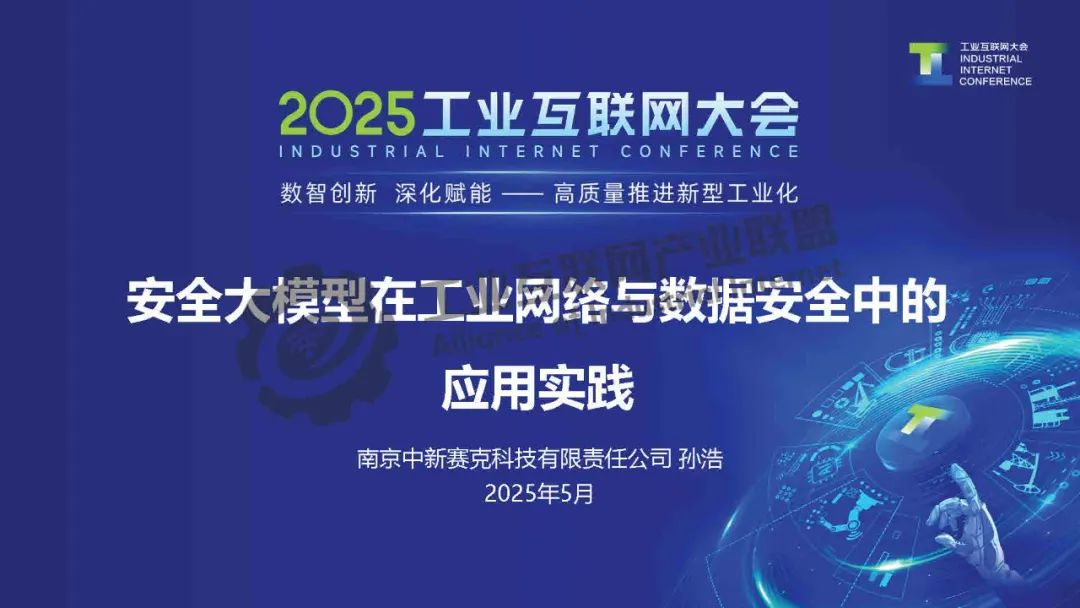 5月23日,在2025工業(yè)互聯(lián)網(wǎng)大會(huì)“新型工業(yè)化網(wǎng)絡(luò)與數(shù)據(jù)安全專題活動(dòng)”上,南京中新賽克科技有限責(zé)任公司副總經(jīng)理孫浩發(fā)表了《安全大模型在工業(yè)網(wǎng)絡(luò)與數(shù)據(jù)安全中的應(yīng)用實(shí)踐》的主題演講。