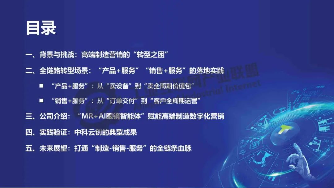 王哲介紹,中科云創針對高端制造營銷轉型困境,提出"產品+服務"和"銷售+服務"全鏈路解決方案,推動從單純賣設備向全周期價值服務升級,通過"MR+AI眼鏡智能體"技術賦能,實現從訂單交付到客戶全周期運營的數字化營銷轉型,典型實踐驗證了其有效性,未來將致力于打通"制造-銷售-服務"全鏈條協同。