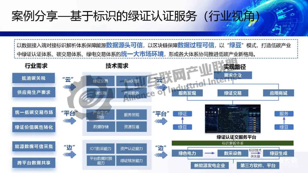 基于標識的綠證認證服務通過對接國家工業(yè)互聯(lián)網標識解析體系,打通光伏行業(yè)設備資產可信采集傳輸鏈條,創(chuàng)建異構光伏設備的統(tǒng)一數(shù)據(jù)模板,為分布式光伏設備頒發(fā)全球唯一且不可篡改的標識數(shù)字身份證,生成光伏行業(yè)產品可信資產標識,實現(xiàn)分布式光伏能源行業(yè)的可信資產管理、定位和監(jiān)測。