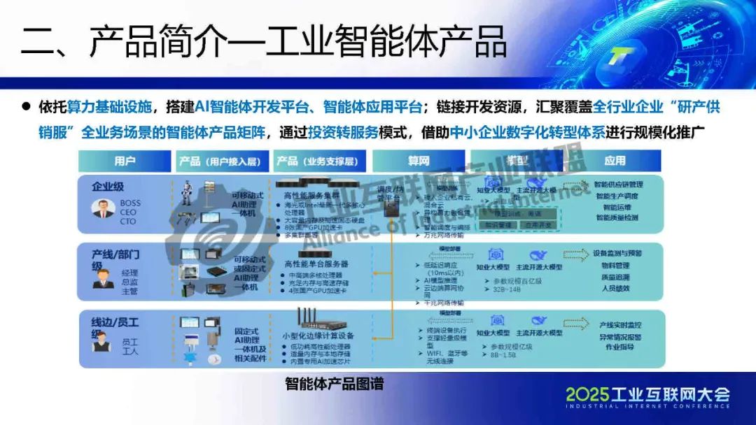 李程介紹,浪潮云洲以新型工業數字基礎設施為基礎,通過以數據服務為核心的智能制造服務大、中、小型企業,賦能園區集群,提高產業鏈、供應鏈協同創新。工業智能體產品依托算力基礎設施,搭建AI智能體開發平臺、智能體應用平臺,鏈接開發資源,匯聚覆蓋全行業企業“研產供銷服”全業務場景的智能體產品矩陣,通過投資轉服務模式,借助中小企業數字化轉型體系進行規模化推廣。