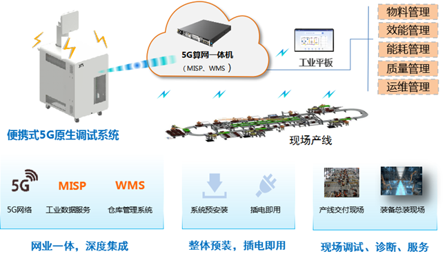 5G原生產(chǎn)線調(diào)試系統(tǒng),作為服務(wù)產(chǎn)線的輕量化便攜工具,基于UniEngine算網(wǎng)一體機(jī)預(yù)集成5G網(wǎng)絡(luò)和明珞MISP(工業(yè)物聯(lián)網(wǎng)智能制造服務(wù)平臺(tái)),實(shí)現(xiàn)云網(wǎng)業(yè)一體化部署,OICT深度融合。項(xiàng)目現(xiàn)場(chǎng)開機(jī)即用,實(shí)現(xiàn)5G網(wǎng)絡(luò)和產(chǎn)線應(yīng)用同步上線,減少網(wǎng)絡(luò)和應(yīng)用系統(tǒng)部署成本和時(shí)間,縮短產(chǎn)線交付、調(diào)試和量產(chǎn)周期,提高產(chǎn)線服務(wù)效率。