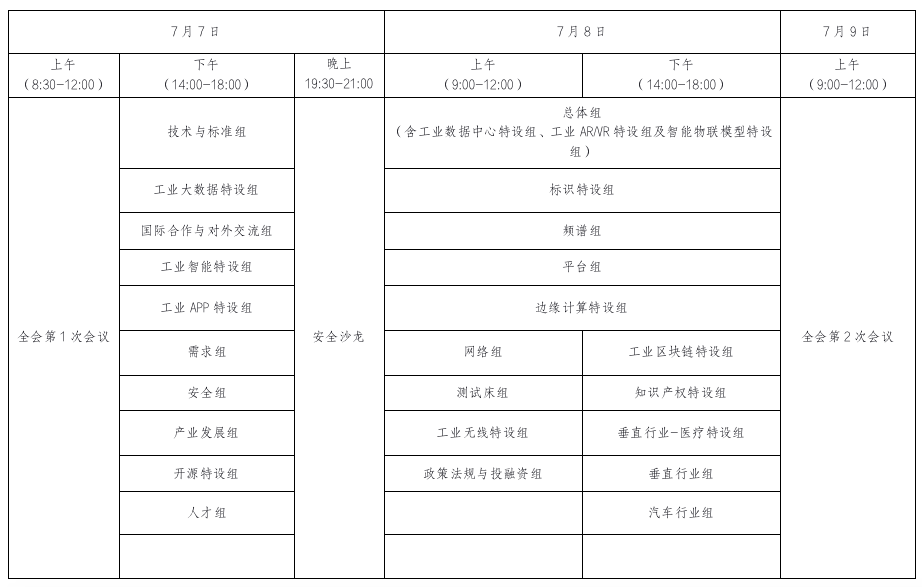 | 9:30-12:00 | 一、各工作組工作進展及計劃 1. 工業區塊鏈特設組 2. 總體組 3. 頻譜組 4. 工業數據中心特設組 5. 技術與標準組 6. 邊緣計算特設組 7. 標識特設組 8. 垂直行業生物醫藥特設組 9. 垂直行業組 10. 知識產權特設組 11. 工業大數據特設組 12. 需求組 13. 工業APP特設組 14. 工業AR/VR特設組 15. 人才組 16. 國際合作與對外交流組 17. 安全組 18. 工業智能特設組 19. 工業無線特設組 20. 測試床組 21. 垂直行業組-汽車組 22. 網絡組 23. 平臺組 24. 產業發展組 25. 智能物聯模型特設組 26. 開源特設組 27. 政策法規與投融資組 二、分聯盟工作進展及計劃