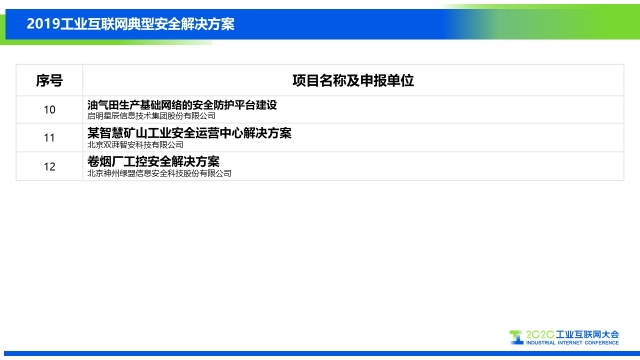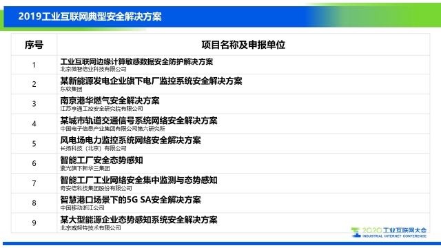 為使廣大工業互聯網從業者能了解工業互聯網安全的發展情況,AII安全組啟動匯編了《工業互聯網典型安全解決方案案例匯編(2019)》,報告共匯編了業內12個典型安全解決方案,具體名單如下: