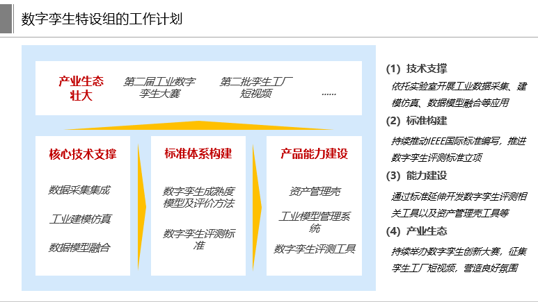 下一步,數字孿生特設組將加快《工業數字孿生成熟度模型與評價方法》國際標準編制,推動《工業數字孿生評測驗證》標準在聯盟評審及發布,并基于標準同步開發應用成熟度評測系統,加快評測服務推廣。持續探索多模型融合及模型互操作工程化應用,并將籌備開展第二屆工業數字孿生大賽。