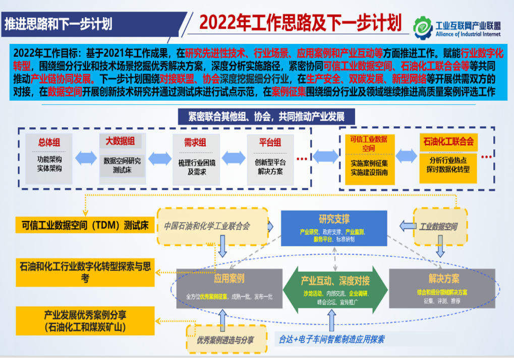產業發展組會議由主席張東主持,圍繞可信工業數據空間、石化煤炭礦山等先進技術及重點行業為主題,組織展開了數字化轉型演講、產業發展報告、應用案例分享三個環節。在數字化轉型演講環節,邀請到中國電信研究院、華為、阿里云等數字化領域專家就數據空間測試床工作部署、業務場景、先進性技術做相關分析與研討。同時,臺達分享了自身通過對自動化系統和智能產線等應用探索,結合行業特點對企業進行數字化賦能的實踐。2021年工作組在石油石化領域引進了優質客戶,建立了供需關系對接。2022年,工作組也將邀請石油和化工工業聯合會開展石油化工案例評審工作。會上還邀請到石油和化工工業聯合會市場部李海洋處長圍繞產業發展、安全生產、降本增效、雙碳發展等重要領域進行分享。工作組前期圍繞石油化工和煤炭礦山行業開展應用案例征集工作,共收到34家應用案例,會上邀請到6家案例單位進行分享,為產業實踐提供參考。后續,工作組將會圍繞細分行業及領域,繼續推進高質量案例的評選工作。
