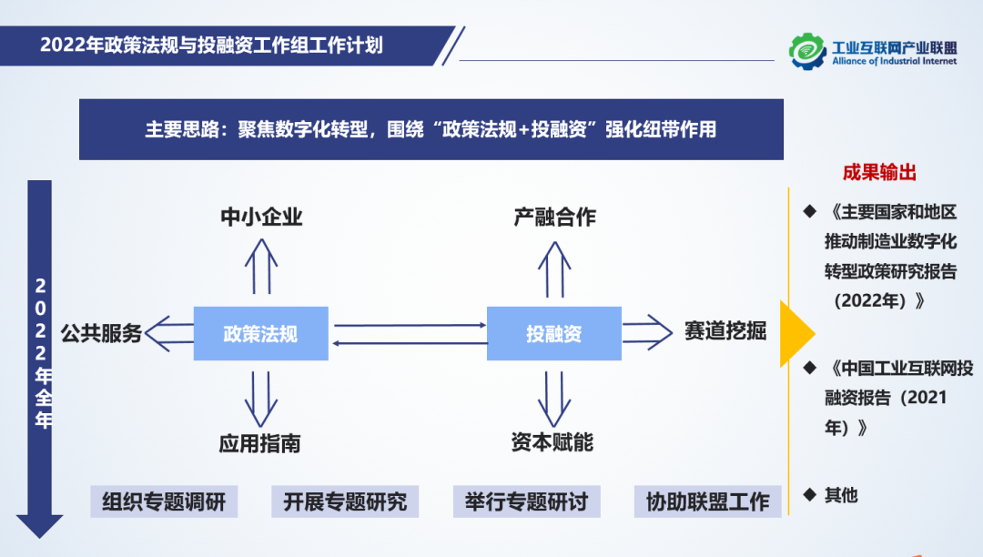政策法規與投融資組會議主要圍繞政策法規調研和投融資展開。首先,中國信通院高級經濟師王欣怡介紹了特設組一季度主要工作,華為公司工業數字化首席戰略官胡靜宜、航天云網業務總監侯俊分別介紹了產融合作和產教融合的相關情況。中國信通院政經所宋凱捷、安逸波分別介紹了工業互聯網政策評估和成效評估的問卷填寫情況。相關專家分享了《中國工業互聯網投融資報告(2021年)》的主要內容,提交工作組審議并聽取了相關意見。此外,工作組還向參會代表通報了2022年一季度投融資活動跟蹤的主要情況,從投融資角度為洞察行業發展趨勢、熱點賽道等提供了全新視角。最后,組內各位專家共同討論了2022年的工作計劃,將繼續聚焦產業政策和投融資兩大領域,圍繞中小企業數字化轉型政策、產融合作和產教融合、全球工業互聯網投融資態勢跟蹤等領域,繼續強化工作組的紐帶作用,積極參與聯盟其他工作組政策法規與投融資相關工作,強化為產業發展賦能的能力建設。