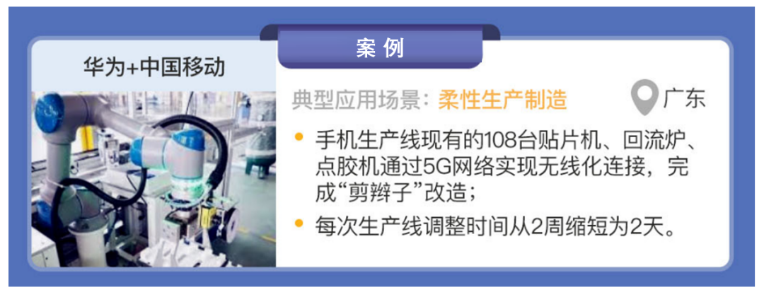 華為與中國(guó)移動(dòng)合作,在廣東省松山湖工廠利 8 用 5G 技術(shù)實(shí)現(xiàn)了柔性生產(chǎn)制造場(chǎng)景的應(yīng)用。華為松山湖工廠原有手機(jī)生產(chǎn)車間需要布線9 萬(wàn)米,每條生產(chǎn)線平均擁有186 臺(tái)設(shè)備,生產(chǎn)線每半年隨新手機(jī)機(jī)型的更新需要進(jìn)行升級(jí)和調(diào)整,物料變更、工序增減等要求車間所有網(wǎng)線的重新布放,每次調(diào)整需要停工 2 周,以每28 秒一部手機(jī)計(jì)算,一天停工影響產(chǎn)值達(dá) 1000 多萬(wàn)。通過(guò)5G 與工業(yè)互聯(lián)網(wǎng)的融合應(yīng)用,華為松山湖工廠把生產(chǎn)線現(xiàn)有的108 臺(tái)貼片機(jī)、回流爐、點(diǎn)膠機(jī)通過(guò) 5G 網(wǎng)絡(luò)實(shí)現(xiàn)無(wú)線化連接,完成“剪辮子”改造,每次生產(chǎn)線調(diào)整時(shí)間從2 周縮短為2 天。同時(shí),在手機(jī)組裝過(guò)程中的點(diǎn)隔熱膠、打螺釘、手機(jī)貼膜、打包封箱等工位部署視覺(jué)檢測(cè)相機(jī),通過(guò)5G 網(wǎng)絡(luò)連接,把圖片或視頻發(fā)送到部署在 MEC 上的(人工智能)AI 模塊中進(jìn)行訓(xùn)練,一方面多線共享樣本后縮短了模型訓(xùn)練周期,另一方面實(shí)現(xiàn)了從“多步一檢”到“一步一檢”模式改變,及時(shí)發(fā)現(xiàn)產(chǎn)品質(zhì)量問(wèn)題。