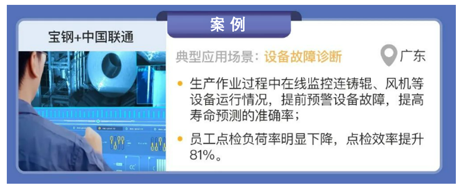 寶鋼與中國(guó)聯(lián)通合作,在廣東省湛江市開展“流程行業(yè) 5G+工業(yè)互聯(lián)網(wǎng)高質(zhì)量網(wǎng)絡(luò)和公共服務(wù)平臺(tái)”項(xiàng)目建設(shè),利用 5G 技術(shù)實(shí)現(xiàn)了連鑄輥、風(fēng)機(jī)等設(shè)備故障診斷場(chǎng)景的應(yīng)用。采集連鑄輥編碼、位置、所處區(qū)段受到的熱沖擊溫度、所處區(qū)段的夾緊力與鑄坯重力的合力等數(shù)據(jù),通過5G網(wǎng)絡(luò)實(shí)時(shí)傳輸至設(shè)備故障診斷等相關(guān)系統(tǒng),采用人工智能和大數(shù)據(jù)技術(shù)對(duì)不同區(qū)段的連鑄輥的壽命進(jìn)行預(yù)測(cè),減少了現(xiàn)場(chǎng)布線的工作量,提高了壽命預(yù)測(cè)的準(zhǔn)確率。同時(shí),采集風(fēng)機(jī)振動(dòng)、電流、電壓、溫度、風(fēng)量等運(yùn)行數(shù)據(jù),通過5G網(wǎng)絡(luò)實(shí)時(shí)傳輸至設(shè)備故障診斷等相關(guān)系統(tǒng),實(shí)現(xiàn)生產(chǎn)作業(yè)過程中風(fēng)機(jī)設(shè)備運(yùn)行情況的在線監(jiān)控,提前預(yù)警設(shè)備故障,通過對(duì)風(fēng)機(jī)設(shè)備的在線監(jiān)控,員工點(diǎn)檢負(fù)荷率明顯下降,點(diǎn)檢效率提升 81%。
