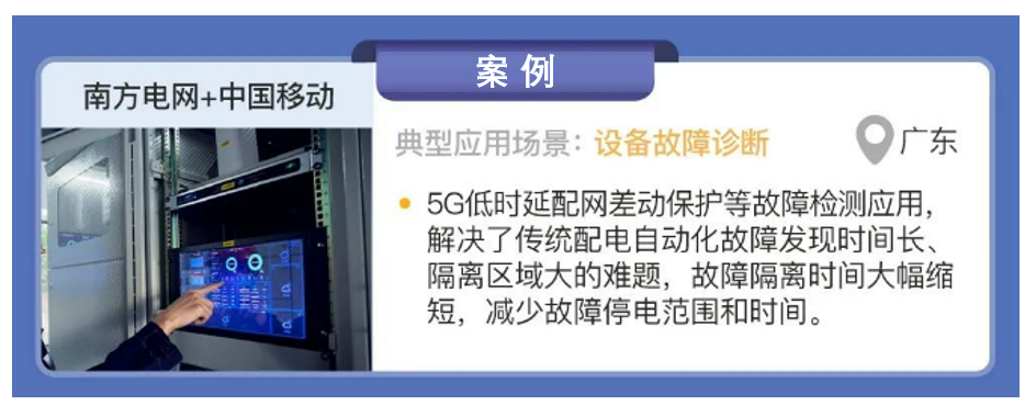 南方電網(wǎng)與中國(guó)移動(dòng)合作,在廣東省廣州市開展了“5G+智能電網(wǎng)”項(xiàng)目建設(shè),實(shí)現(xiàn)了設(shè)備故障診斷場(chǎng)景的應(yīng)用。在配網(wǎng)差動(dòng)保護(hù)應(yīng)用中,利用電力專用5G用戶前置設(shè)備(CPE)進(jìn)行高精度網(wǎng)絡(luò)授時(shí),通過5G網(wǎng)絡(luò)低時(shí)延特性,采集配電網(wǎng)電流相量數(shù)據(jù),傳輸至配電自動(dòng)化主站,及時(shí)掌握線路情況,并進(jìn)行在線監(jiān)測(cè)和診斷,發(fā)現(xiàn)故障區(qū)段后,依靠配電自動(dòng)化主站進(jìn)行故障隔離和供電恢復(fù),解決了傳統(tǒng)配電自動(dòng)化故障發(fā)現(xiàn)時(shí)間長(zhǎng)、故障隔離區(qū)域大的問題,將故障隔離時(shí)間大幅縮短,最大程度減少故障停電范圍和時(shí)間。