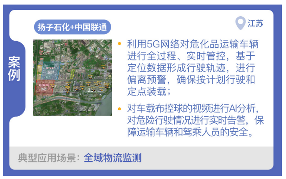 中國石化揚子石油化工有限公司與中國聯通合作,開展了“5G+安全石化”項目建設,實現了全域物流監測場景的應用。利用5G+北斗技術,實現生產區內危化品車輛的高精度定位,并實時傳輸至危化品運輸管控平臺。平臺對進入揚子生產區的危化品車輛進行全過程、實時管控,基于定位數據形成行駛軌跡,進行偏離預警,有效保證危化品車輛按照規定路線行駛和在規定地點裝載。通過5G網絡將車載布控球拍攝的視頻傳輸至邊緣云平臺進行人工智能(AI)分析,對危化品車輛危險行駛、路中障礙、前車距離過近等進行實時告警,有效保障了運輸車輛和駕乘人員的安全。