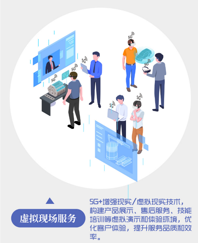 虛擬現場服務主要包括產品展示體驗、輔助技能學習、遠程運維指導等三類服務。產品展示體驗服務通過對工業產品的外型數據及內部結構進行立體化建模,構建虛擬數字展廳,通過5G網絡傳輸至平板電腦、增強現實/虛擬現實(AR/VR)眼鏡等智能終端,與數字模型實時互動,實現產品細節的沉浸式體驗和感受。輔助技能學習服務基于5G和AR/VR融合構建貼近真實場景的全虛擬場景,進行操作技能培訓和自由操作練習,提高技能學習效率。遠程運維指導服務通過在全虛擬場景中,疊加遠端專家指導數據形成端云協同,使端側獲得實時操作指導,提升運維服務的效率和質量。