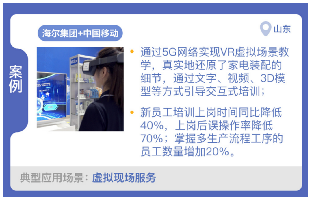 海爾集團與中國移動合作,開展了“5G全連接園區”項目建設,實現了虛擬現場服務場景的應用。基于算法上云架構,通過5G網絡實現VR內容的云端存儲。根據使用需求下載對應的VR內容用于現場教學,真實地還原了家電裝配的細節,通過文字、圖片、聲音、視頻、3D模型等方式引導交互式培訓,幫助培訓人員迅速掌握技術要領,降低了部署成本,解決了新員工培訓上崗時間周期長的問題。自海爾工廠VR員工培訓平臺投入使用以來,新員工培訓上崗時間同比降低40%,上崗后誤操作率降低70%;老員工自主學習時長增加35%,掌握多生產流程工序的產線員工數量增加20%。