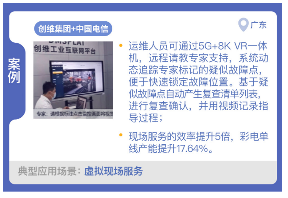 深圳創維-RGB電子集團有限公司與中國電信合作,開展了“5G+8K柔性智能工廠”項目建設,實現了虛擬現場服務場景的應用。利用自主研發的創維8K VR一體機設備和5G完美融合,形成“云管端”的整體解決方案。遇到問題時,現場運維人員佩戴創維8K VR一體機,根據系統投射到視野前方的信息獲得可視化指導幫助。信息輔助無法解決問題時,打開遠程專家支持,專家以第一視角畫面清晰獲知現場情況,用紅框標記疑似故障點,實時反饋至VR眼鏡。系統能夠對疑似故障點進行動態跟蹤,方便運維人員快速鎖定故障位置。通過記錄疑似故障點,自動產生復查清單列表,實現對維修過程關鍵點復查確認。同時,每次遠程指導都以視頻形式進行記錄,用于案例分析或教學使用。通過應用該技術,創維現場服務的效率提升了5倍,彩電單線產能提升17.64%,一線質檢員工減少40%,出口提升71.25%。