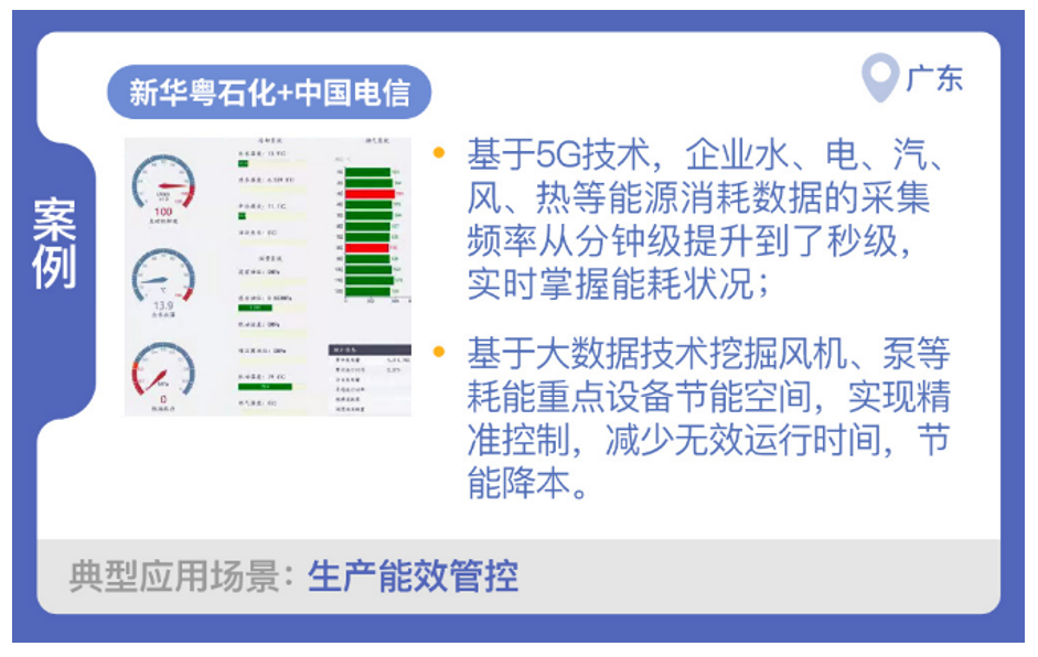 廣東新華粵石化股份有限公司與中國電信合作,開展了“能耗在線監(jiān)測”項(xiàng)目建設(shè),實(shí)現(xiàn)了生產(chǎn)能效管控場景的應(yīng)用。利用水表、電表、蒸汽測量儀、風(fēng)速表、冷熱計(jì)量表等計(jì)量設(shè)備采集企業(yè)水、電、汽、風(fēng)、熱等能源消耗數(shù)據(jù),通過5G網(wǎng)絡(luò)傳輸至企業(yè)綜合能源管理平臺(tái),并按時(shí)按需上傳到廣東省能耗在線監(jiān)管平臺(tái),采集頻率從分鐘級(jí)提升到了秒級(jí),顯著提升了數(shù)據(jù)采集的效率。綜合能源管理平臺(tái)可實(shí)時(shí)監(jiān)測電流、電壓、冷熱量計(jì)量等運(yùn)行參數(shù),通過用電趨勢分析、用電異常監(jiān)測、用熱對(duì)比分析等方法,實(shí)時(shí)掌握能耗狀況。基于大數(shù)據(jù)分析技術(shù)挖掘風(fēng)機(jī)、泵等耗能重點(diǎn)設(shè)備節(jié)能空間,進(jìn)行節(jié)能改造,實(shí)現(xiàn)精準(zhǔn)控制,減少無效運(yùn)行時(shí)間,提高了生產(chǎn)能耗信息化管理水平,降低了生產(chǎn)成本。