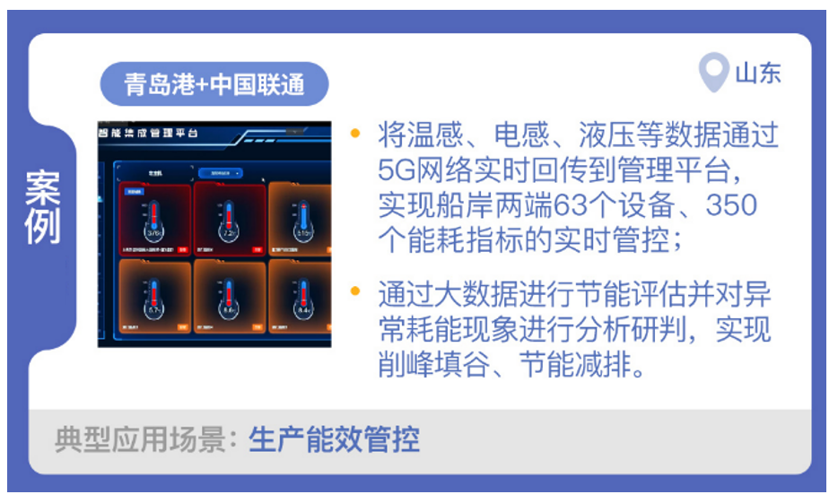 山東港口青島港集團(tuán)有限公司與中國聯(lián)通合作,開展了“青島港5G智慧港口”項(xiàng)目建設(shè),實(shí)現(xiàn)了生產(chǎn)能效管控場景的應(yīng)用。通過5G網(wǎng)絡(luò),將溫感、電感、液壓、煙感等傳感器采集的數(shù)據(jù)實(shí)時(shí)回傳到智能集成管理平臺(tái),實(shí)現(xiàn)船岸兩端63個(gè)設(shè)備、350個(gè)能耗指標(biāo)的實(shí)時(shí)管控。通過大數(shù)據(jù)分析對(duì)船舶動(dòng)力系統(tǒng)進(jìn)行節(jié)能評(píng)估,動(dòng)態(tài)調(diào)整船舶的經(jīng)濟(jì)航速,實(shí)現(xiàn)削峰填谷、節(jié)能減排。通過自動(dòng)化采集設(shè)備運(yùn)行數(shù)據(jù),提升了危險(xiǎn)環(huán)境下的安全生產(chǎn)管理能力,提高安全生產(chǎn)預(yù)測效率和管理水平。針對(duì)異常耗能現(xiàn)象進(jìn)行分析研判,為設(shè)備的檢修維護(hù)提供決策支持。每年節(jié)省拖輪運(yùn)維費(fèi)用100萬元,節(jié)省人工檢測成本40萬元,檢測效率提升30%。
