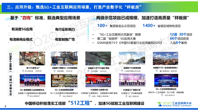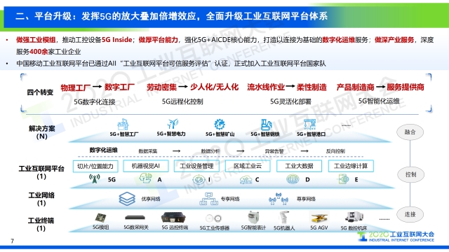 “工業互聯網是5G應用范圍最廣、解決方案最成熟、價值提升最顯著的領域之一。5G不僅是運營商的5G,更是千行百業的5G。在推進‘5G+工業互聯網’創新發展的實踐中,中國移動緊抓新基建帶來的空前機遇,已通過5G垂直行業布局,初步形成了示范效應,并努力實施‘五個升級’策略,即加快網絡升級、平臺升級、應用升級、模式升級和生態升級,推動‘5G+工業互聯網’加速發展。未來,中國移動將繼續深化貫徹落實‘512工程’,強化使命擔當,攜手各界合作伙伴,全力推進‘5G+工業互聯網’發展。”