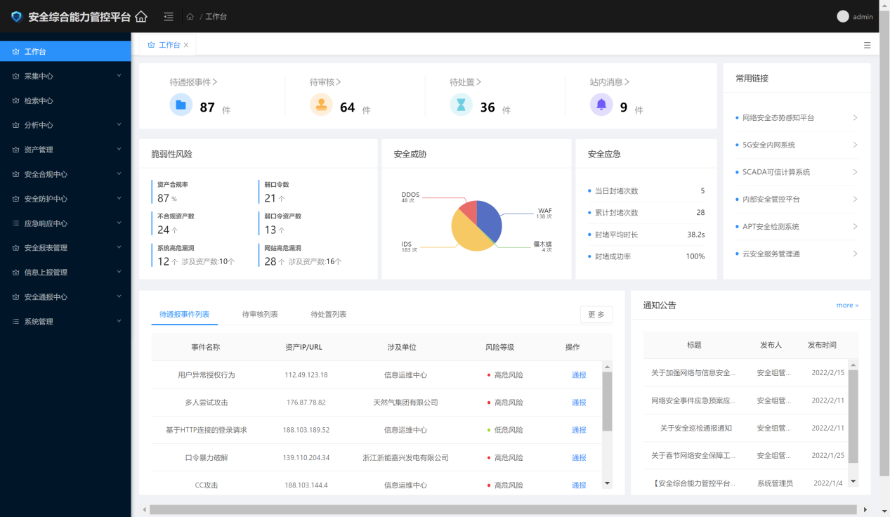 安全綜合能力管控平臺建設后,面向安全日常運營、重大活動保障等場景提供安全合規檢查、安全應急處置、安全策略審計、安全事件處理等安全服務入口。