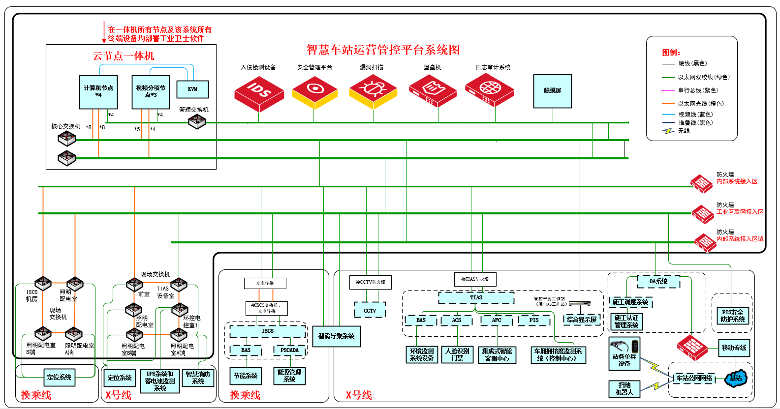 在地鐵站既有系統(tǒng)上增設(shè)智慧車站運(yùn)營管控平臺并針對性進(jìn)行網(wǎng)絡(luò)安全建設(shè),運(yùn)營管控平臺包括車站既有綜合監(jiān)控系統(tǒng)、智能視頻分析系統(tǒng)、客流分析預(yù)測系統(tǒng)、實時定位系統(tǒng)、站務(wù)巡視系統(tǒng)、站務(wù)單兵系統(tǒng)、智慧消防系統(tǒng)等系統(tǒng),并對車站既有系統(tǒng)進(jìn)行升級,實現(xiàn)全面提升乘客服務(wù)質(zhì)量,提高車站管理工作效率,同時為運(yùn)營分公司的安全運(yùn)營生產(chǎn)提供決策支持。運(yùn)管平臺以站級ISCS為基礎(chǔ),利用物聯(lián)網(wǎng)、視頻智能分析技術(shù),實現(xiàn)車站態(tài)勢全息感知,將設(shè)備狀態(tài)與報警等自動化數(shù)據(jù)(生產(chǎn)網(wǎng))和智能視頻、運(yùn)營管理、設(shè)備維保、客運(yùn)服務(wù)等信息化數(shù)據(jù)(管理網(wǎng))深度融合,通過大數(shù)據(jù)、人工智能進(jìn)行挖掘分析、綜合利用。