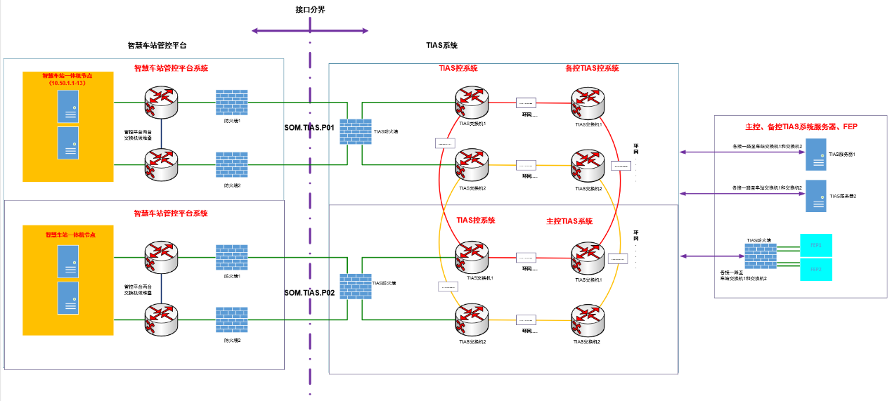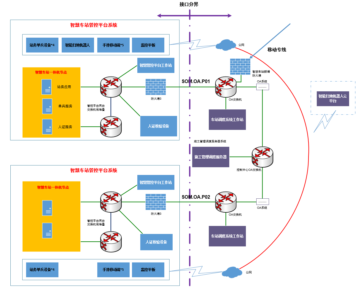 基于數(shù)據(jù)流進(jìn)行梳理分析,智慧車站運(yùn)營管控平臺需接入TIAS系統(tǒng),該平臺功能上設(shè)計為站級TIAS系統(tǒng)的上位系統(tǒng),即通過該平臺實現(xiàn)對TIAS中綜合監(jiān)控部分的設(shè)備監(jiān)控;網(wǎng)絡(luò)上,該系統(tǒng)需要在本站訪問TIAS服務(wù)器、FEP,并通過TIAS環(huán)網(wǎng)分別訪問主控、備控的TIAS實時服務(wù)器(機(jī)電)、FEP,以及實現(xiàn)兩個及以上車站的運(yùn)營管控平臺網(wǎng)絡(luò)互通(僅限于一體機(jī)的部分業(yè)務(wù)虛擬節(jié)點(diǎn)),傳輸內(nèi)容為常規(guī)綜合監(jiān)控監(jiān)控數(shù)據(jù),不含視頻流。智能掃地機(jī)器人、站務(wù)單兵設(shè)備、手持移動終端、監(jiān)控平板(均設(shè)置靜態(tài)IP)通過無線與車站公網(wǎng)連接,車站公網(wǎng)通過控制中心公網(wǎng)與控制中心OA系統(tǒng)的接口實現(xiàn)上述設(shè)備與車站OA系統(tǒng)的通信。