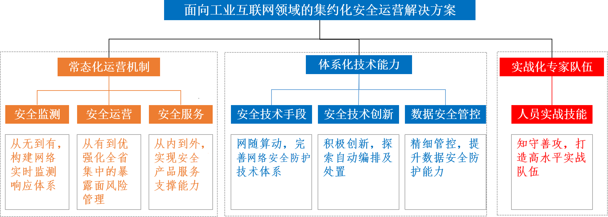 中國移動信安中心打造的集約化安全運營中心,面向工業(yè)互聯(lián)網(wǎng)端到端,對內(nèi)統(tǒng)一負責(zé)企業(yè)內(nèi)各部門的全部安全工作,并積極落實基礎(chǔ)安全運維、數(shù)據(jù)安全管控、安全手段運營、安全攻防團隊的建設(shè)等工作,落實國家和工業(yè)互聯(lián)網(wǎng)領(lǐng)域的工作要求,構(gòu)建常態(tài)化安全集中運營能力。總體發(fā)展下面兩方面的內(nèi)容。
